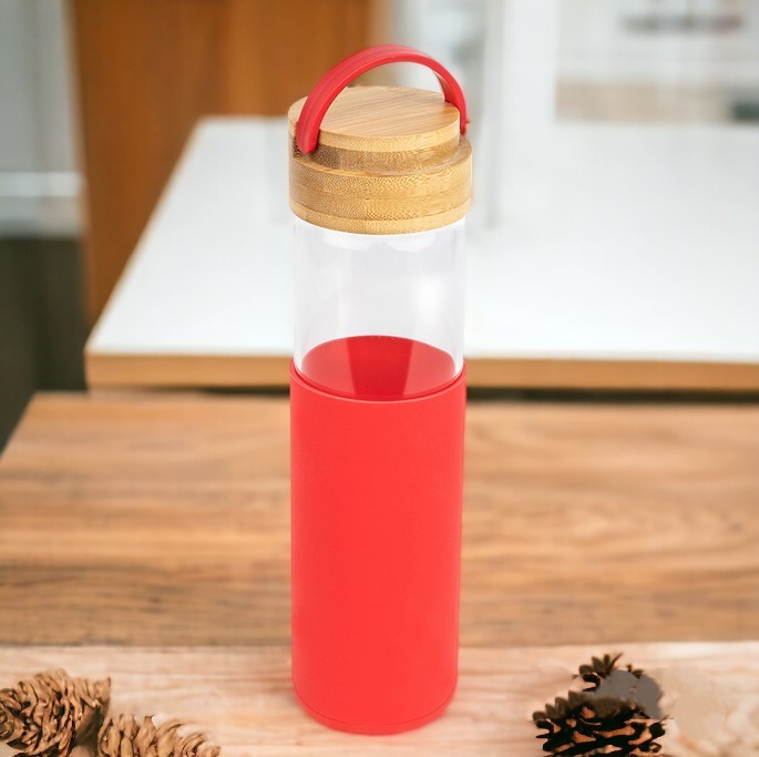Бутылка стеклянная с силиконовой манжетой и бамбуковой крышкой Glass 500 мл. / Термобутылка -1 шт.;