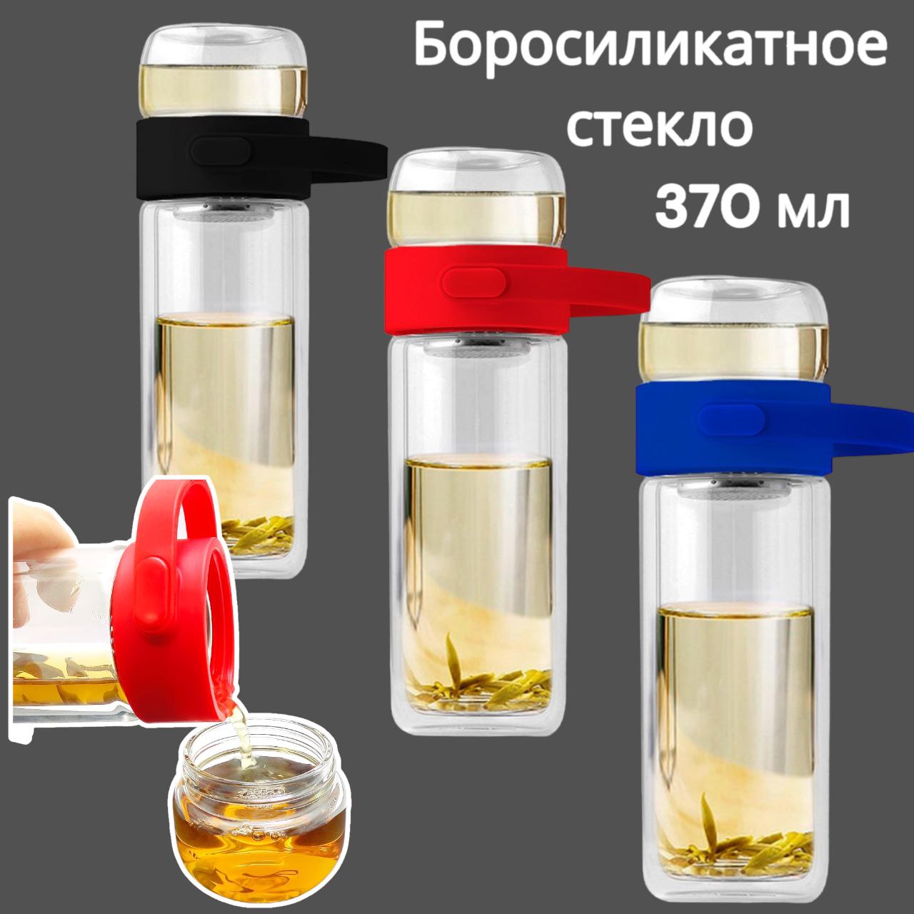 Стеклянная бутылка - термос UNIQUE с ситечком 370 мл. / Двойные стенки, силиконовая ручка– 1 шт.;