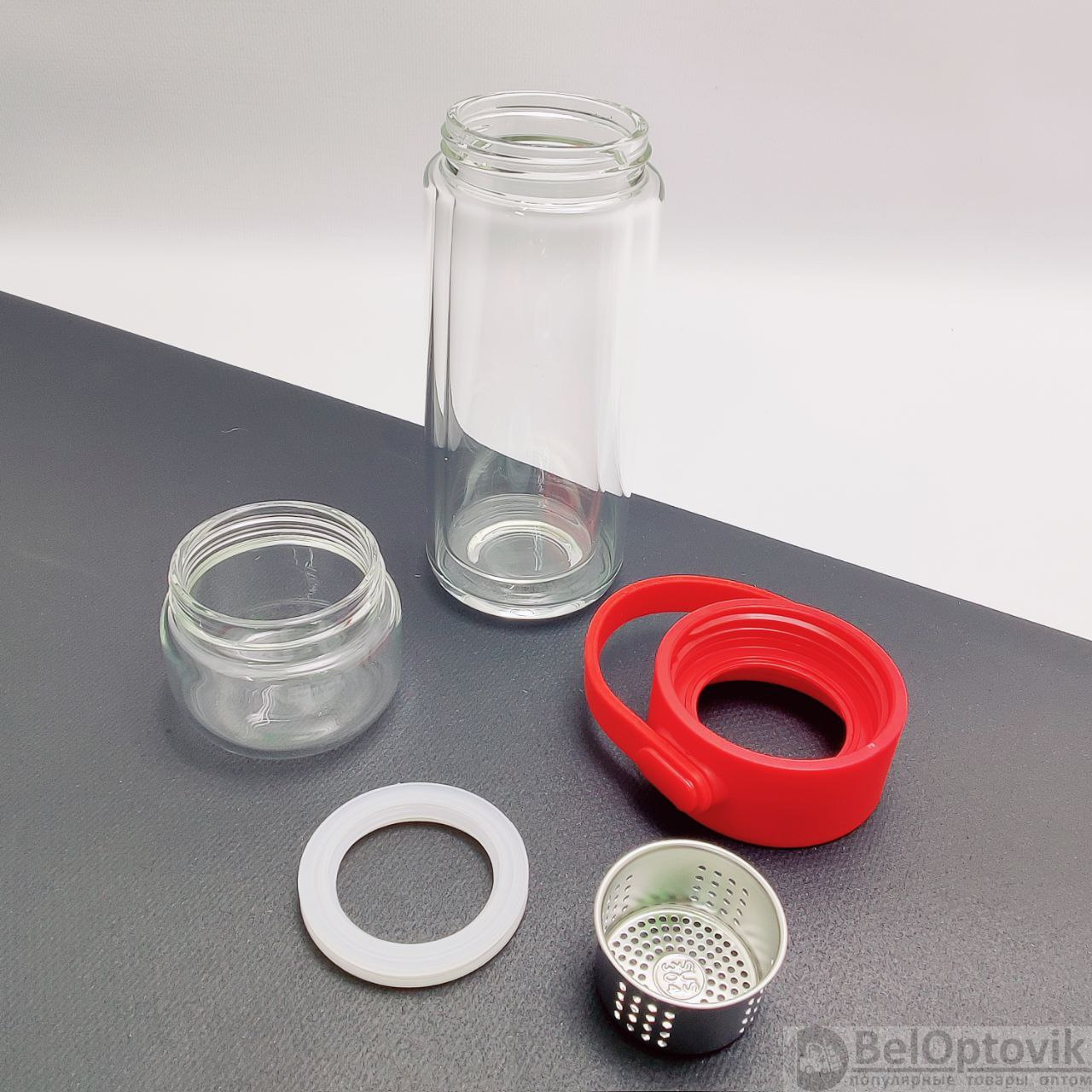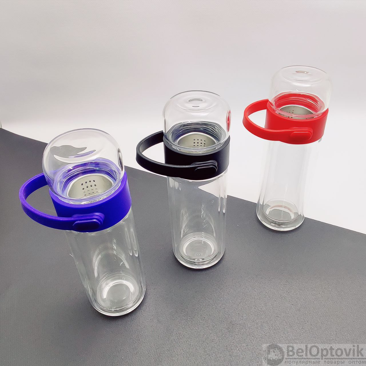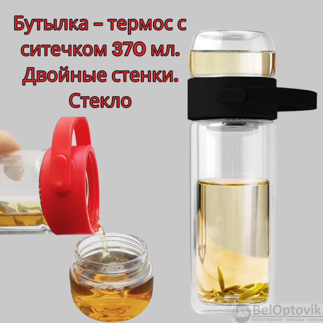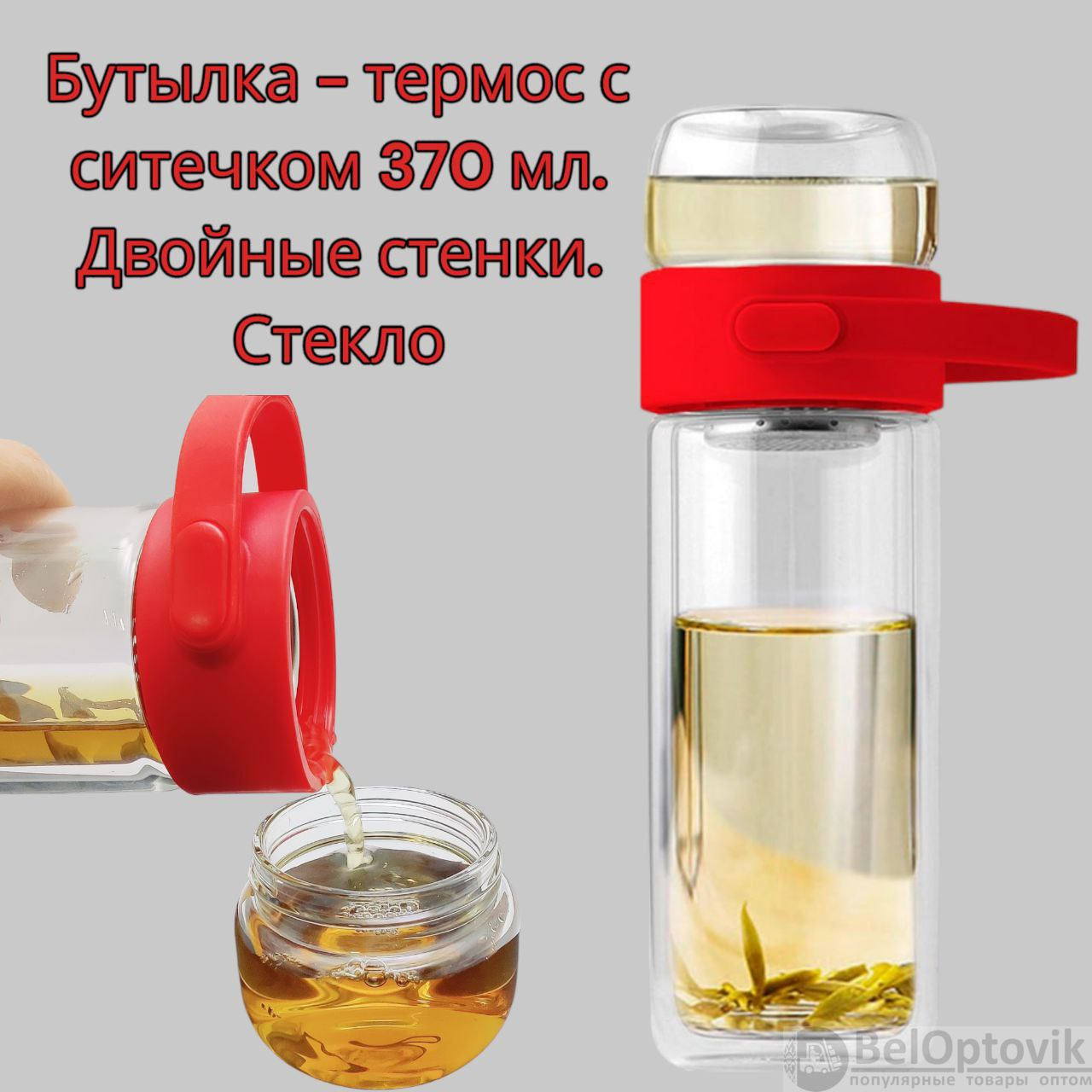 Купить Стеклянная бутылка - термос UNIQUE с ситечком 370 мл. / Двойные стенки, силиконовая ручка на нашем сайте можно ОПТОМ от 20 шт. или меньше, если Вы покупаете у нас и другие товары (сборный заказ).