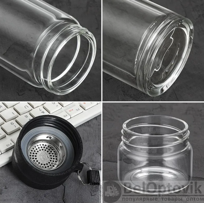 Стильная необычная бутылка- термос "UNIQUE"- находка для людей, ценящих красоту, удобство и практичность! Бутылка-термос не оставит никого равнодушным- прозрачная бутылка с двойными стенками из боросиликатного стекла, ситечком для заваривания вкусных напитков и силиконовой шлейкой для транспортировки- все выполнено качественно и для Вашего удобства! Термобутылка "UNIQUE" - идеальный выбор для тех, кто хочет сохранить свои напитки горячими или холодными на протяжении длительного времени, а также любоваться красивым прозрачным отделением для заваривания, в котором хаотично плавают листочки чая.