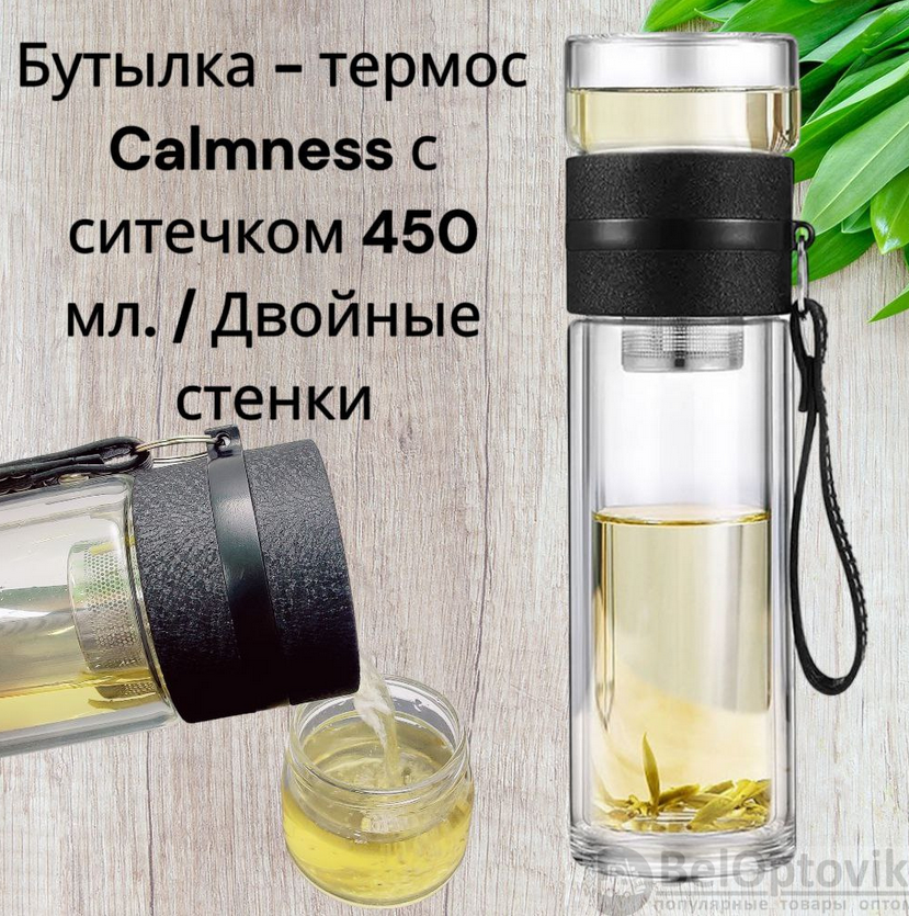 Стильная необычная бутылка- термос "Calmness"- находка для людей, ценящих красоту, удобство и практичность! Бутылка-термос не оставит никого равнодушным- прозрачная бутылка с двойными стенками из боросиликатного стекла, ситечком для заваривания вкусных напитков и ремешком для транспортировки- все выполнено качественно и для Вашего удобства! Термобутылка "Calmness" - идеальный выбор для тех, кто хочет сохранить свои напитки горячими или холодными на протяжении длительного времени, а также любоваться красивым прозрачным отделением для заваривания, в котором хаотично плавают листочки чая.