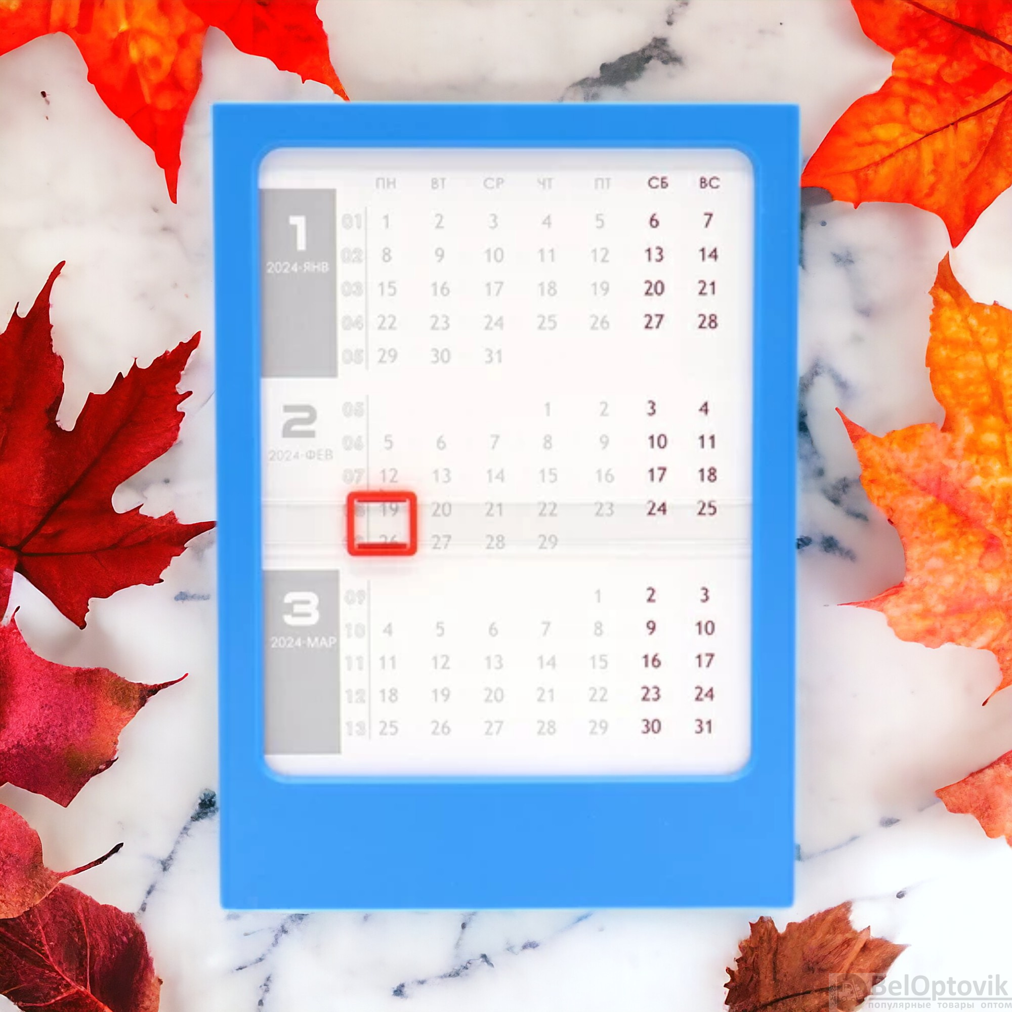 Календарь изготовлен из высококачественного пластика, который обеспечивает долговечность и устойчивость к повседневному износу. Бумажные элементы календаря выполнены из плотной бумаги, что гарантирует четкость печати и удобство в использовании. Варианты нанесения логотипа или индивидуального дизайна включают УФ-печать и Тампопечать большая, что позволяет персонализировать календарь для корпоративных подарков или брендирования.