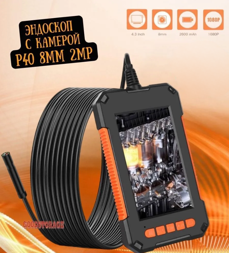 Что такое Промышленный видео-эндоскоп с камерой 8 мм, длиной кабеля 1,86 м. Р-40/экран 4,3"дюйма/HD1080P/водонепроницаемый IP67/2600 мАч