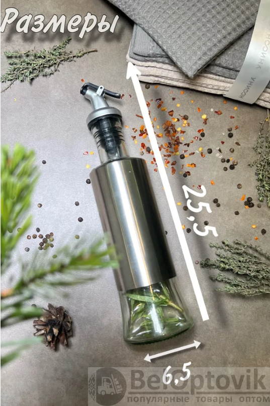Емкость для масла и уксуса выполнена из стекла и металла в виде бутылки, дозатор из металлизированного полипропилена с силиконовой насадкой для плотного прилегания к бутылке.