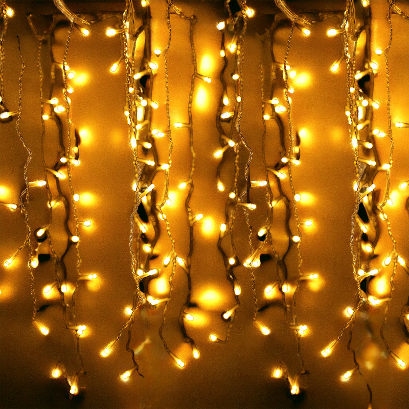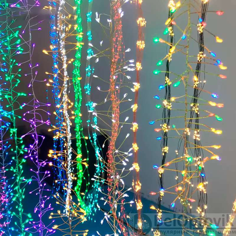 Гирлянда светодиодная "Штора" представляет собой декоративное освещение, которое создает эффект светящейся шторы из медных проводов.