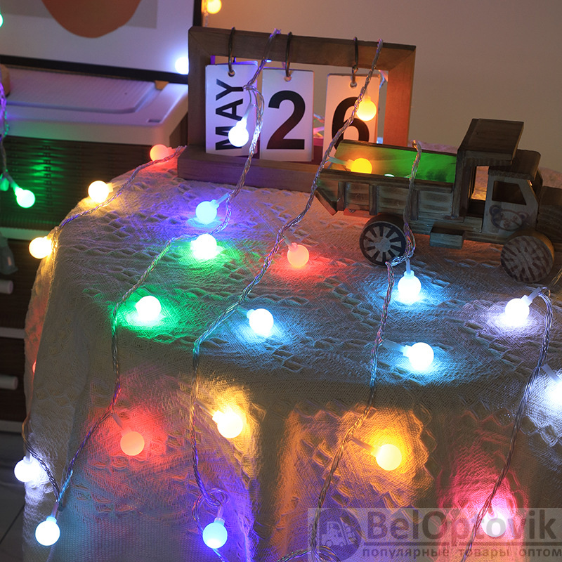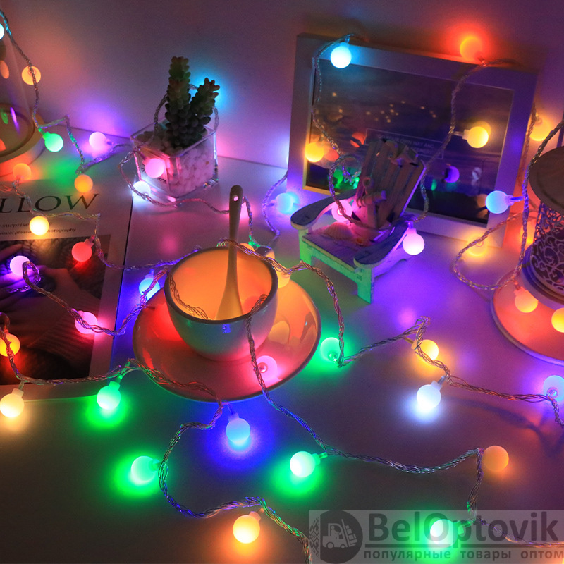 Сочетание нескольких цветов шариков в гирлянде добавит разнообразия и оригинальности декору. Благодаря длине в 10 метров, гирлянда легко может быть размещена на дверной или оконной раме, на стене или вдоль потолка, создав яркую и красочную композицию.