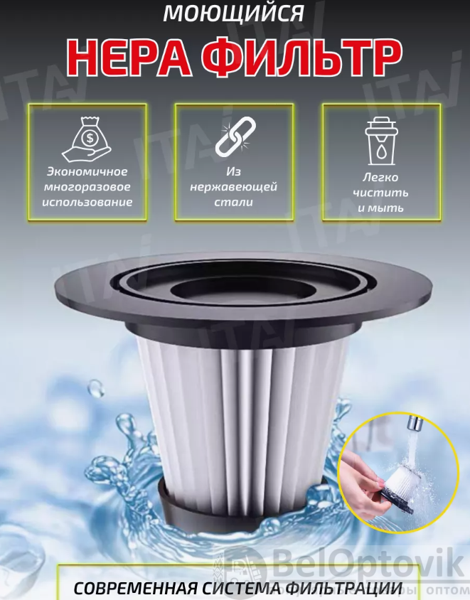 Ручной пылесос для машины соберёт быстро и легко всю пыль и мусор за счет циклонных технологий и многоразового фильтра, который в свою очередь собирает грязь и задерживает в пылесборнике даже самую мельчайшую пыль, а также его можно вынуть и промыть водой, но перед применением обязательно высушить. 20 сантиметровая щелевая насадка поможет достать грязь даже из самых труднодоступных мест.