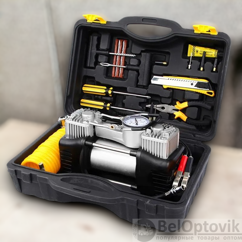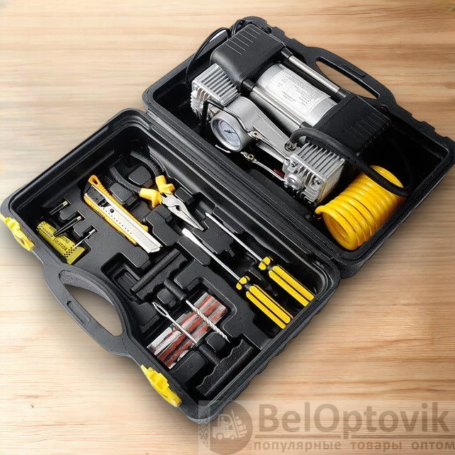 В набор входит Компрессор автомобильный DC12V Чемодан 75L min - это компактный и удобный инструмент для накачивания шин автомобиля. Благодаря своим характеристикам, он подходит для использования как на дороге, так и дома.