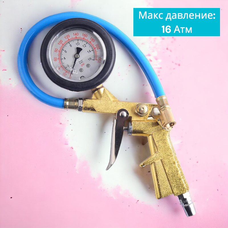 Пистолет для подкачки шин имеет компактный размер и эргономичную форму, что делает его удобным в использовании. Он идеально ложится в руку и легко подсоединяется к шинному клапану. Максимальное давление, которое он может измерить, составляет 16 атмосфер.