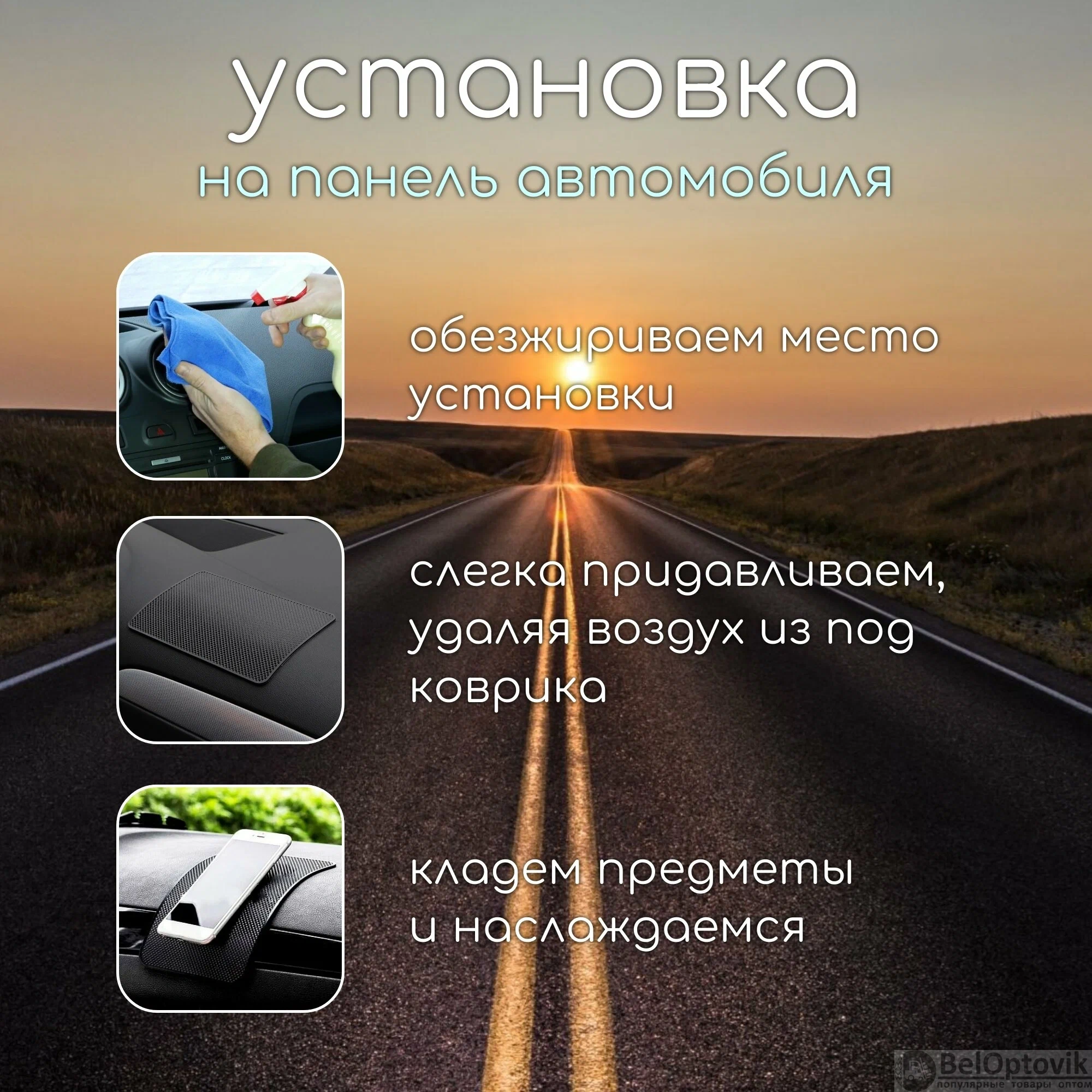 Держатель, выполненный в гравитационном стиле, обеспечивает легкость и удобство в использовании, так как не требует от водителя дополнительных усилий для закрепления устройства. Коврик легко устанавливается на приборную панель с помощью клеевой основы, которая не оставляет следов и не портит внешний вид панели после снятия.