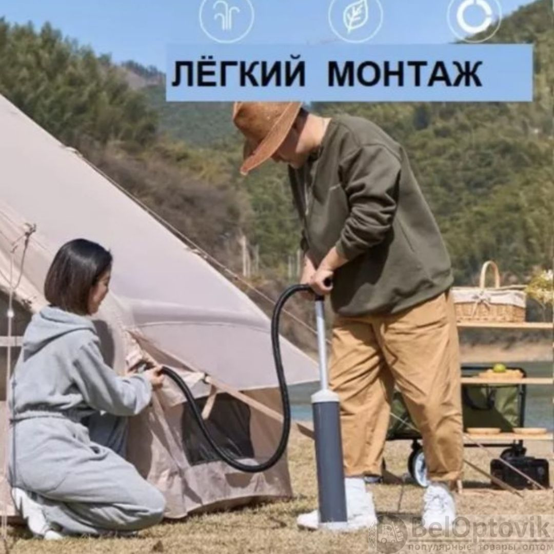 - Быстрая сборка: Палатку можно установить всего за 5 минут. Просто разложите ее и надуйте через 2 боковых клапана.