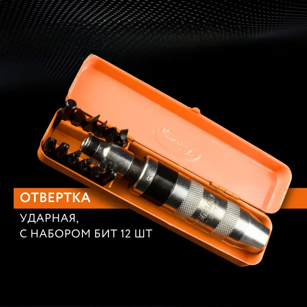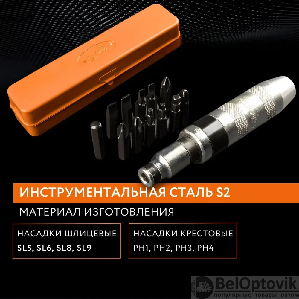 Этот набор ударной отвертки представляет собой идеальный инструмент для профессионалов и любителей, которым необходим надежный инструмент для выполнения широкого спектра задач. Ударная отвертка обеспечивает высокую точность и удобство в использовании благодаря эргономичной рукоятке и балансировке, что делает ее идеальным выбором для длительной работы без усталости. В комплект входят 12 бит различных размеров и форм, что позволяет с легкостью справляться с любыми видами крепежа. Каждая бита изготовлена из высококачественной инструментальной стали S2, обеспечивающей долговечность и устойчивость к износу даже при интенсивном использовании.