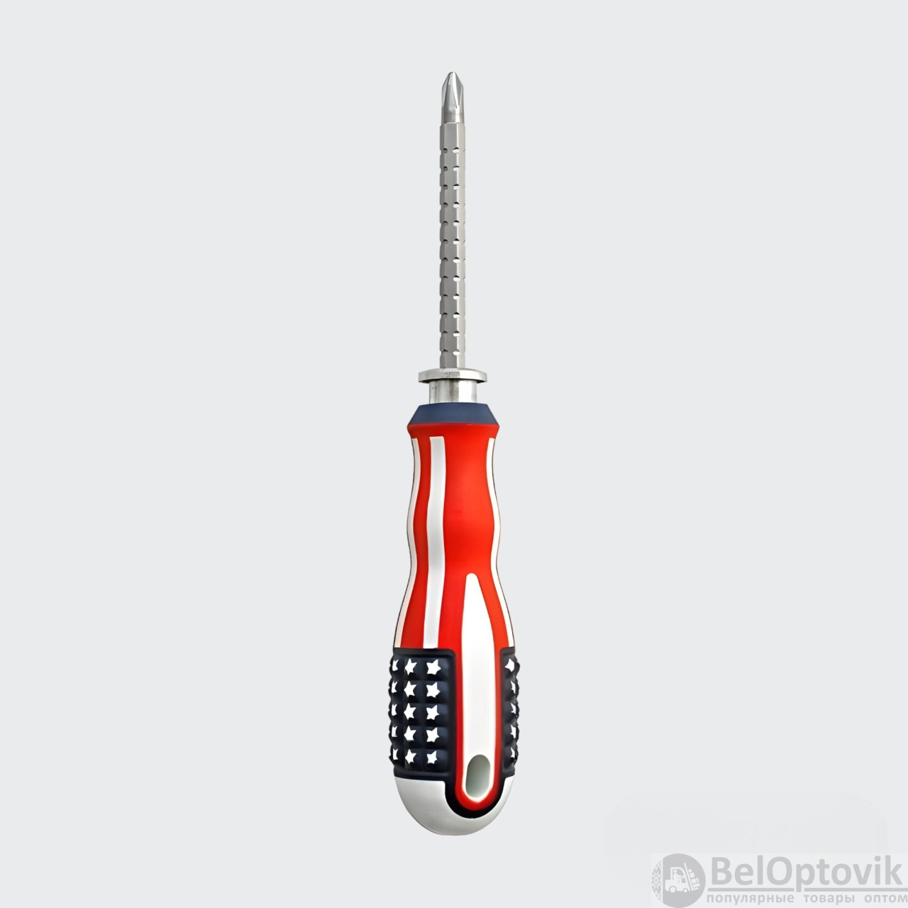 Эта двухсторонняя отвертка с фиксатором "АМЕРИКА" — это инструмент, который сочетает в себе удобство и функциональность. Обрезиненная рукоятка обеспечивает надежный захват и комфорт при использовании, а также служит диэлектриком, что делает этот инструмент безопасным для работы с электричеством. Магнитный стальной стержень удерживает крепежные элементы, предотвращая их падение в труднодоступные места. Оригинальный дизайн не только придает инструменту современный вид, но и способствует удобству использования.