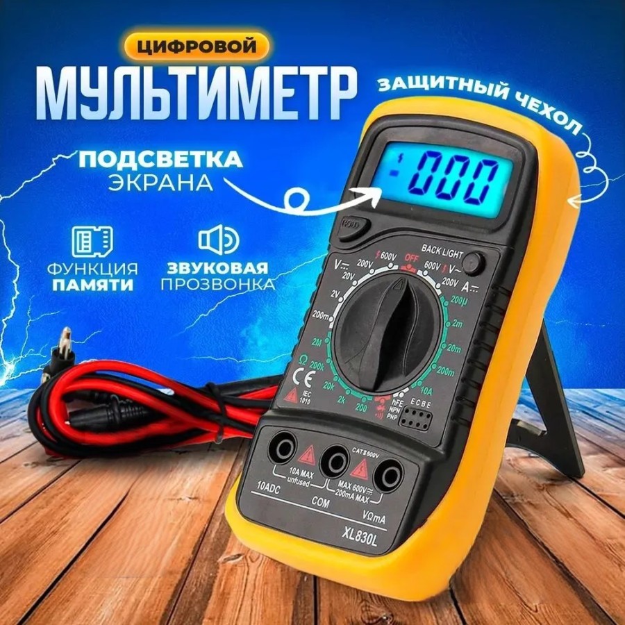 Цифровой мультиметр с звуковой прозвонкой цепи 830L – это универсальный инструмент для измерения напряжения, тока, сопротивления, частоты, ёмкости и других параметров в электрических цепях, индикатор напряжения, измеритель тока, омметр, вольтметр, амперметр, ваттметр.