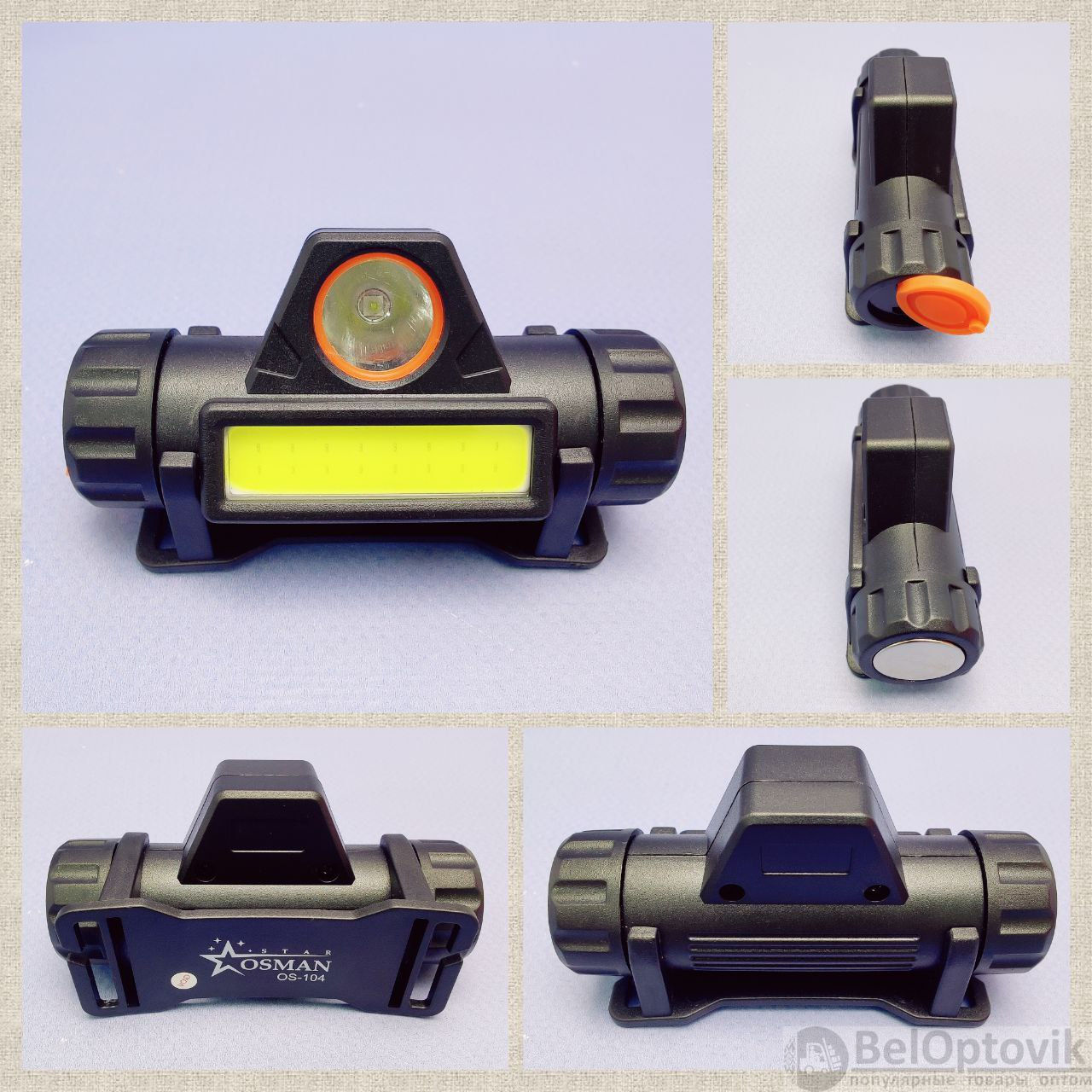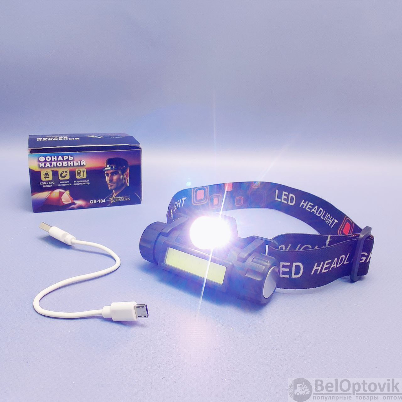 Фонарь налобный аккумуляторный с магнитным основанием, 2 режима работы, СОВ и XPG диоды – 1 шт.;