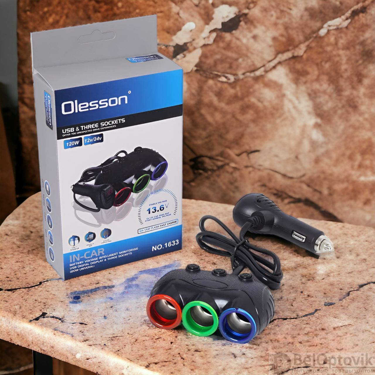 Купить Разветвитель автоприкуривателя 1633 Olesson, 3 разъема, 1 USB порт, 120 Вт, 12 В / 24 В, черный на нашем сайте можно ОПТОМ от 20 шт. или меньше, если Вы покупаете у нас и другие товары (сборный заказ)