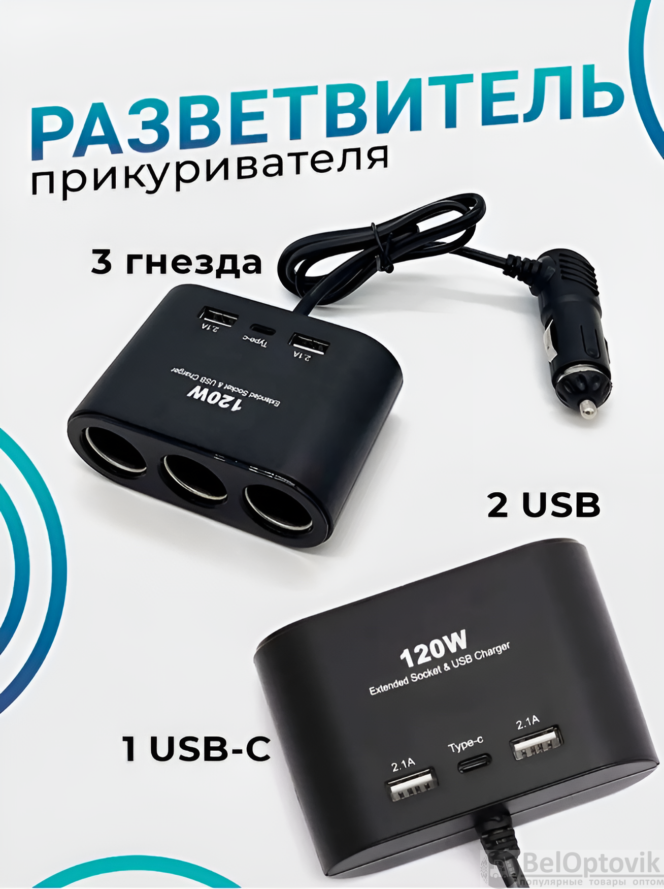 Автомобильный разветвитель прикуривателя – это универсальное устройство, предназначенное для увеличения функциональности системы питания вашего автомобиля. С помощью данного прибора вы сможете одновременно подключать несколько электронных устройств, таких как смартфоны, планшеты, цифровые камеры, GPS-навигаторы и многие другие гаджеты, которые требуют зарядки или питания в дороге. Разветвитель оснащен тремя розетками, идентичными стандартной розетке автомобильного прикуривателя, а также двумя USB-портами с выходным током 2.1А и одним USB Type-C портом, что делает его совместимым с большинством современных устройств.