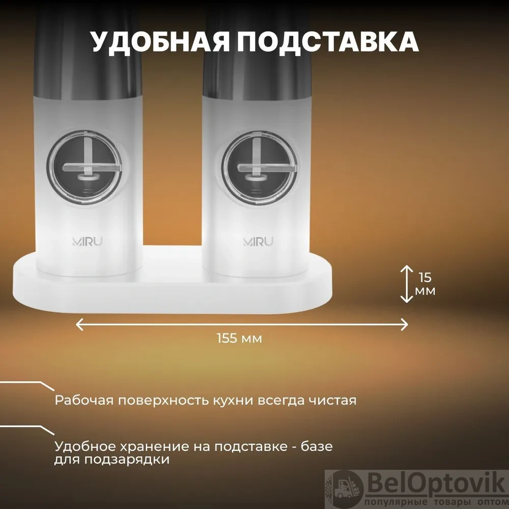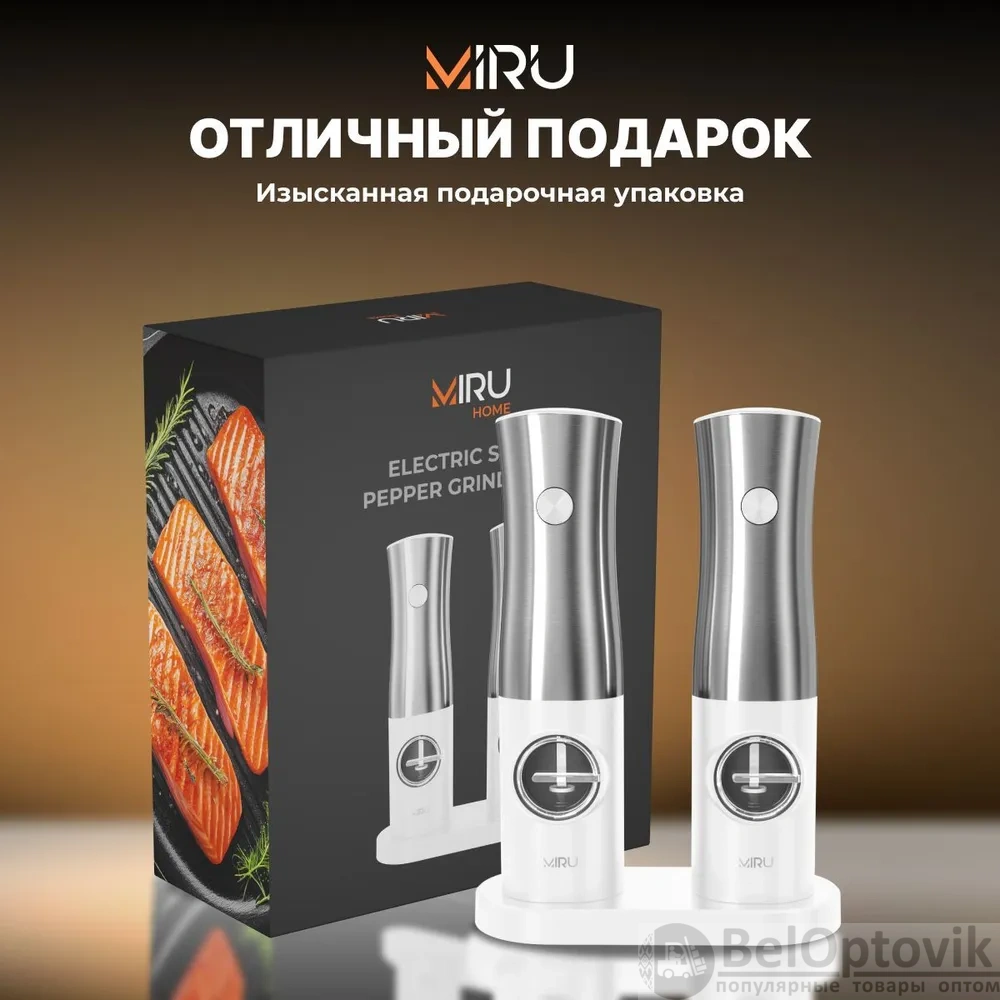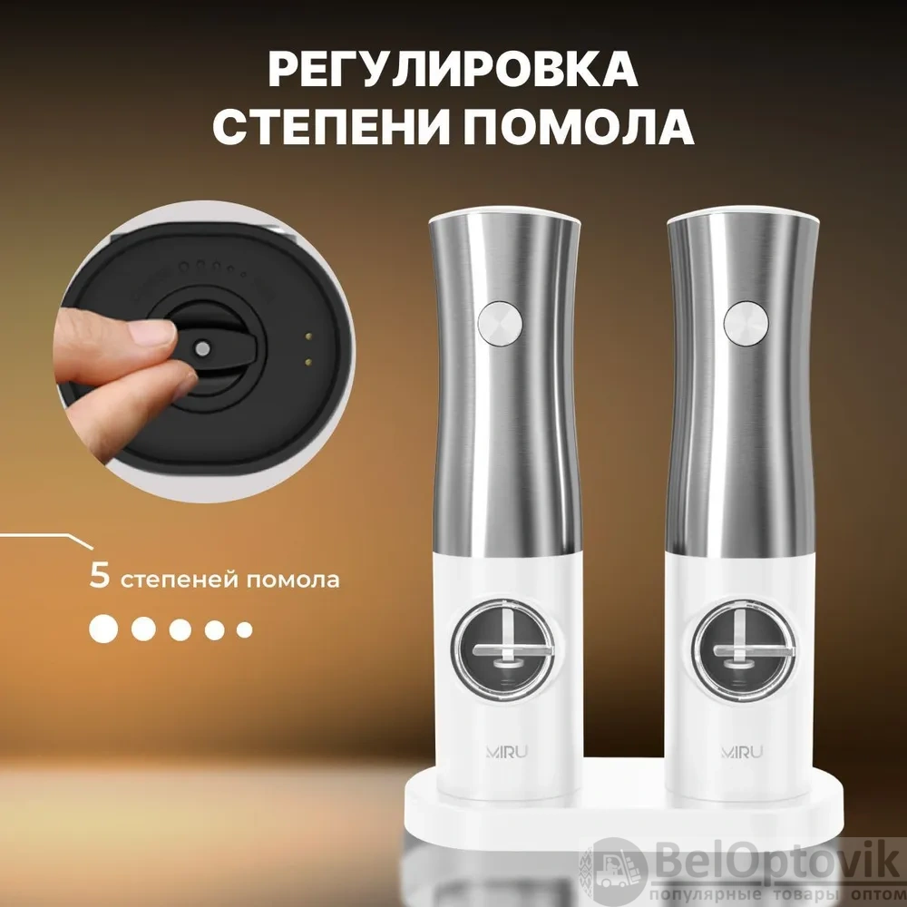 Почему купить Набор электрических мельниц для специй MIRU KA052, с подсветкой, 5 степеней помола, белая / Удобная подставка для хранения и подзарядки оптом выгодно у нас: