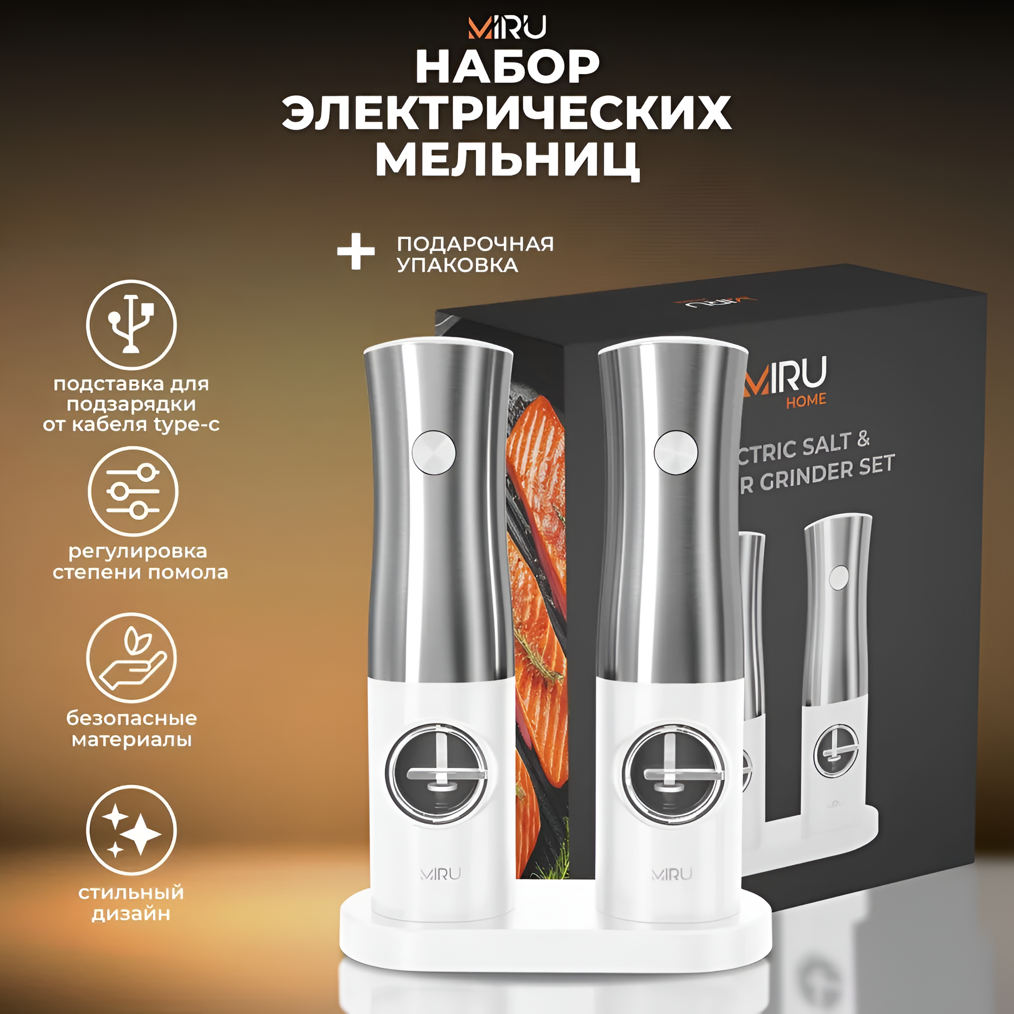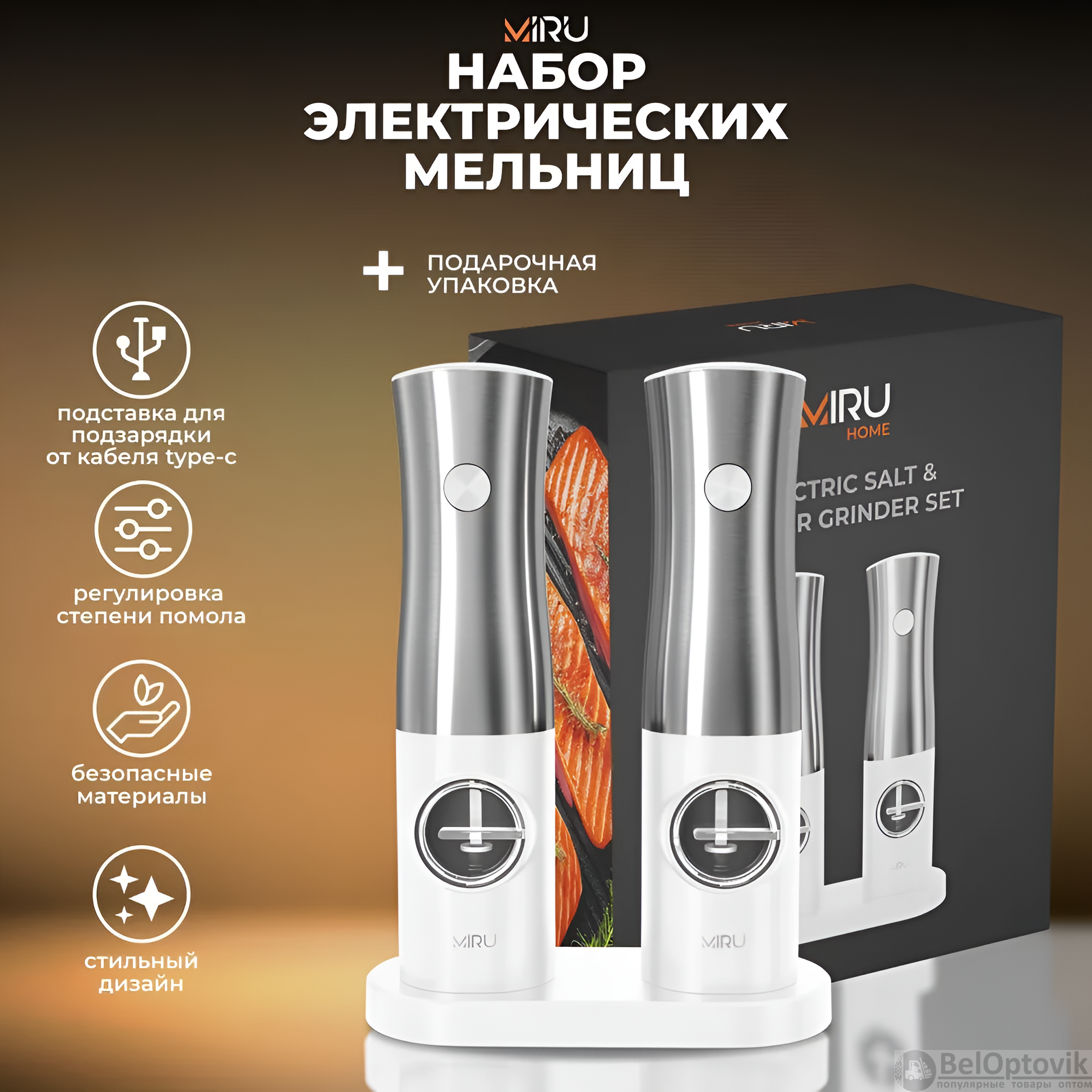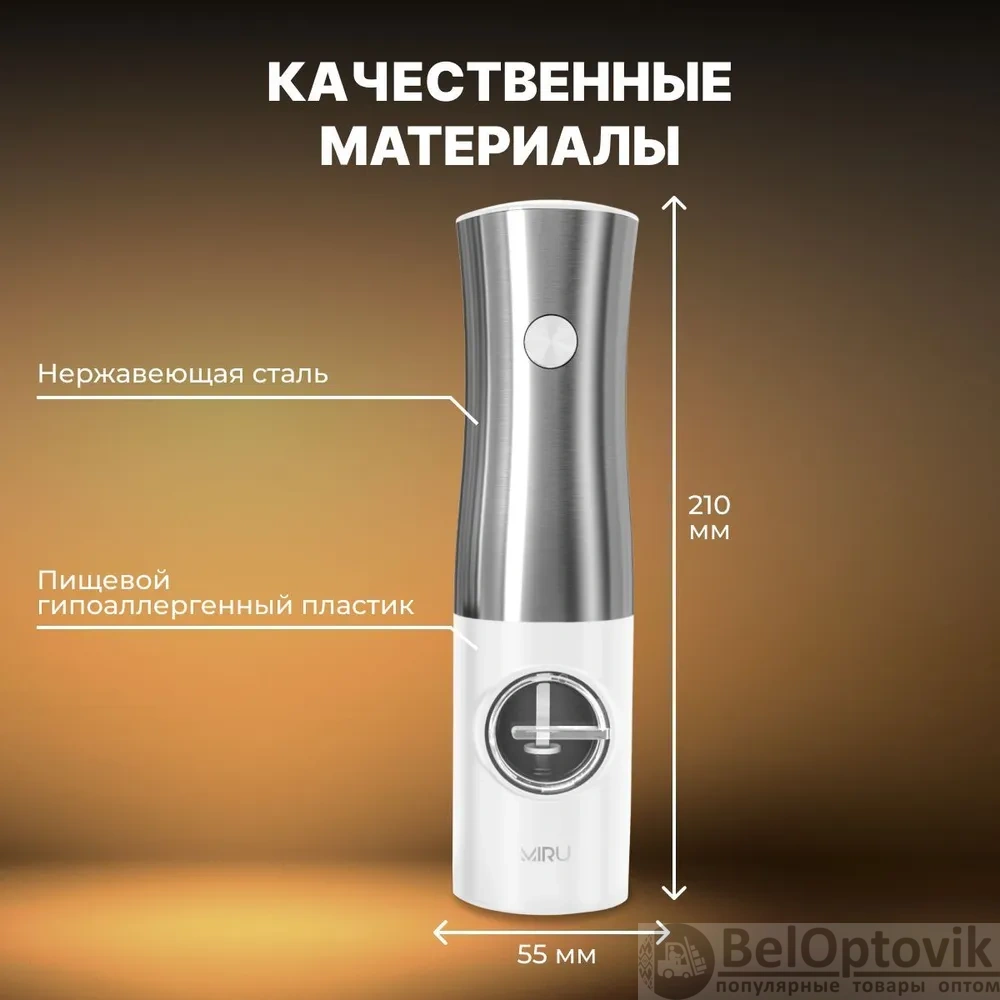Почему купить Набор электрических мельниц для специй MIRU KA052, с подсветкой, 5 степеней помола, белая / Удобная подставка для хранения и подзарядки оптом выгодно у нас: