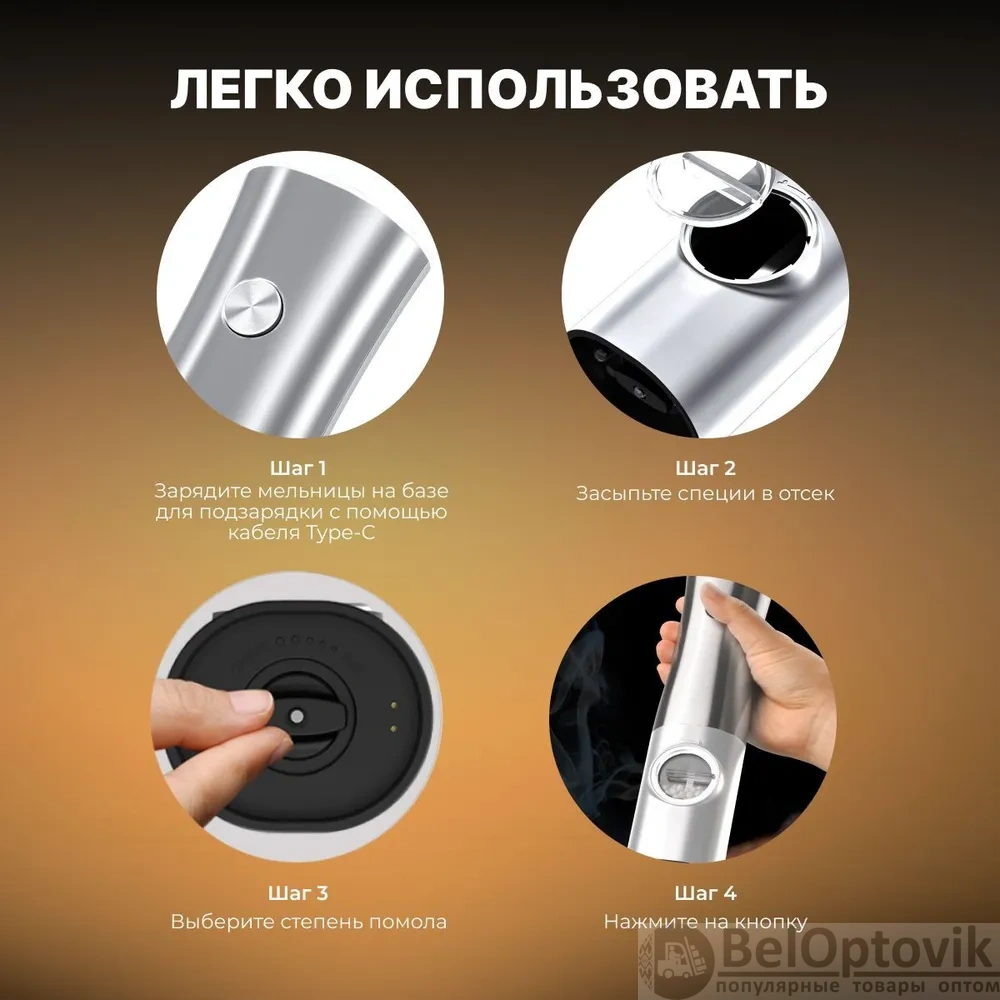 Мельницы изготовлены из пищевых материалов, что гарантирует отсутствие влияния на вкус специй. Мощность устройства составляет 25 Вт, а напряжение питания – 3.7 В. Быстрая зарядка на подставке с помощью Type-C кабеля обеспечивает удобство и экономию времени. Удобная подставка для хранения и подзарядки позволяет держать мельницы в порядке и всегда под рукой.