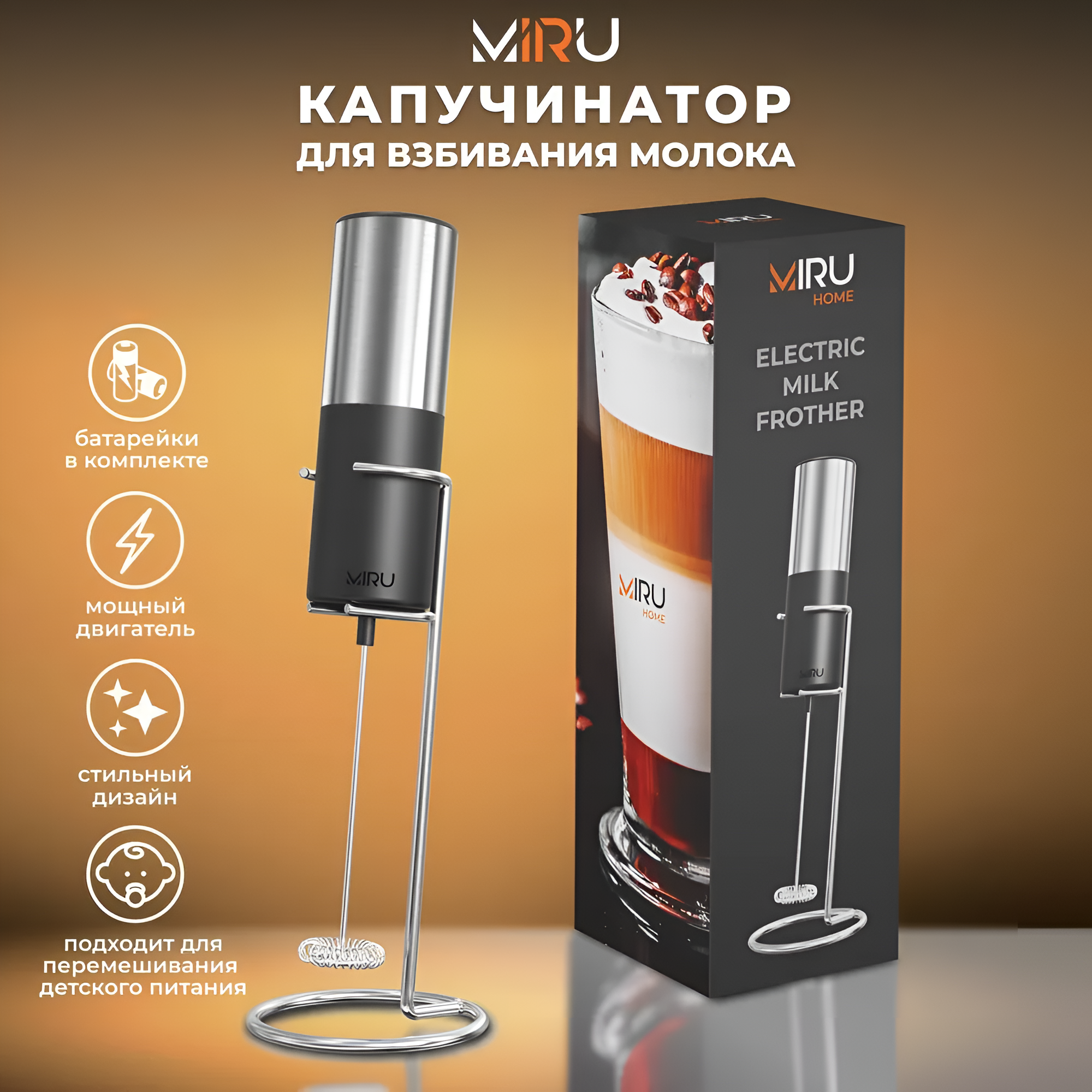 Купить капучинатор, вспениватель молока на подставке MIRU KA053, мощность 6 Вт, черно-серебристый / Мощный двигатель, стильный дизайн на нашем сайте можно ОПТОМ от 20 шт. или меньше, если Вы покупаете у нас и другие товары (сборный заказ).