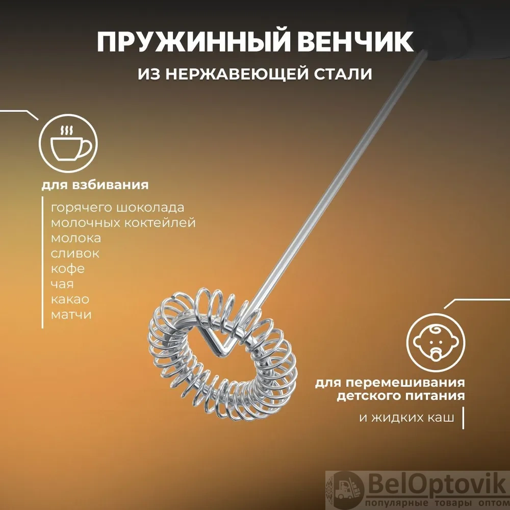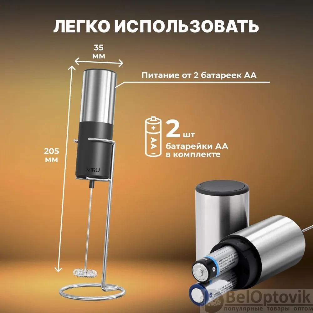 Капучинатор работает от батареек 2×АА (входят в комплект) и имеет мощность 6 Вт, что обеспечивает эффективное и быстрое взбивание молока. Компактные размеры и удобная подставка позволяют легко хранить и использовать капучинатор. Устройство также можно использовать для молочных коктейлей, смешанных напитков, а также для взбивания яиц и соусов.