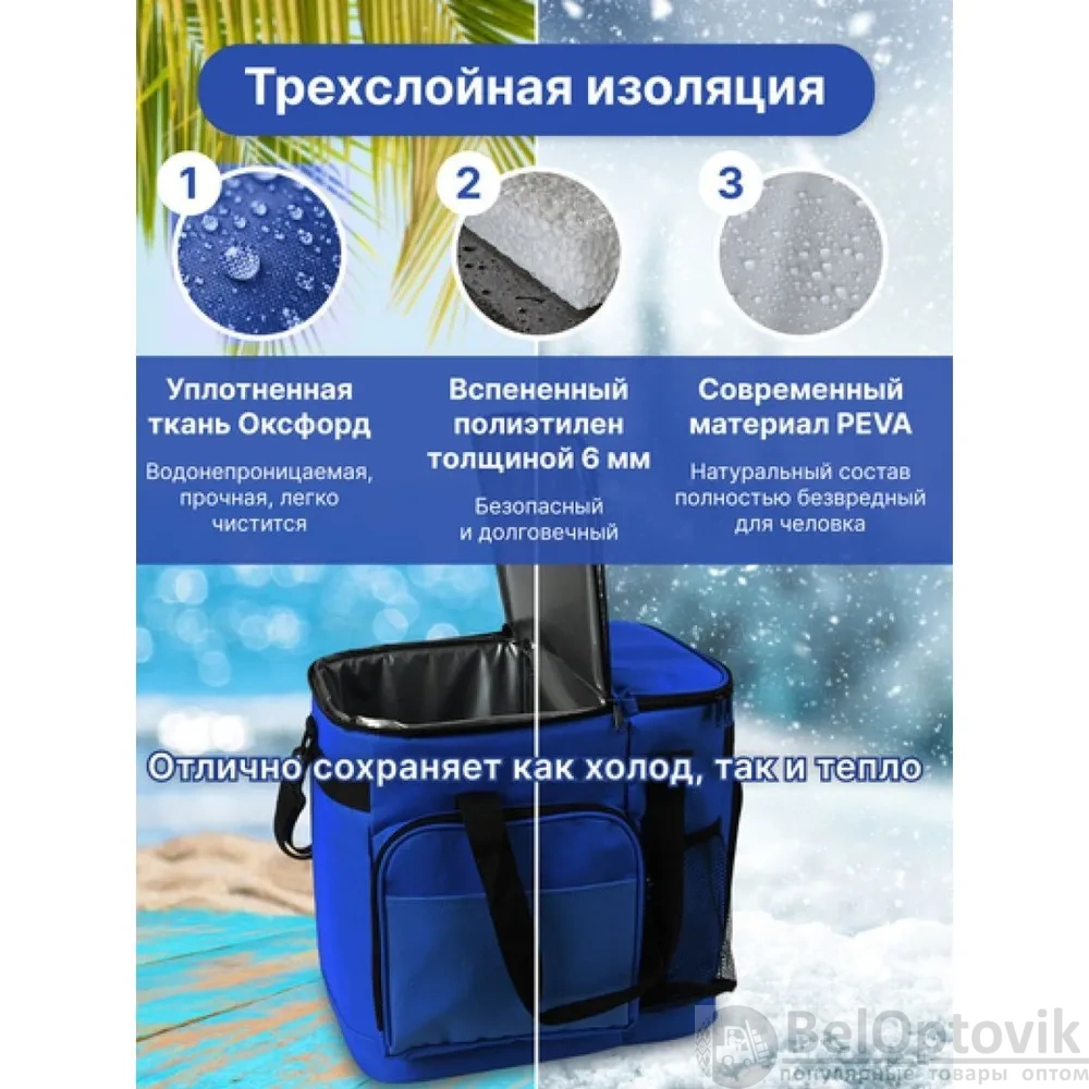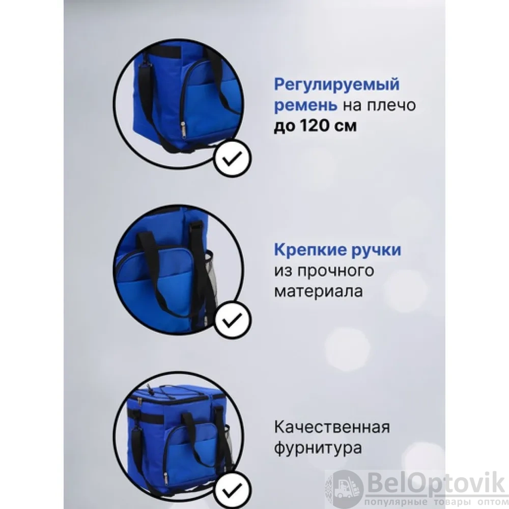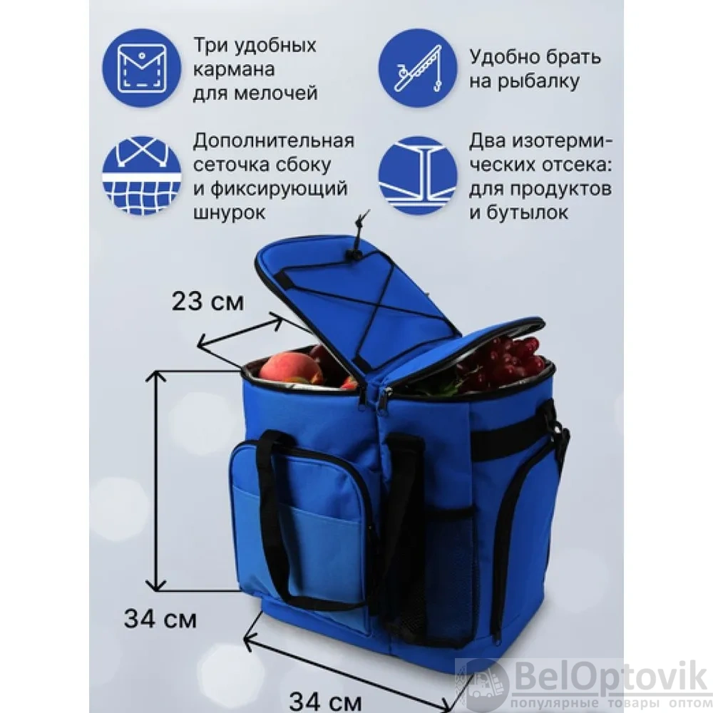Компактные размеры и стильный синий цвет делают эту термосумку не только функциональной, но и привлекательной. Она станет незаменимым аксессуаром для любых поездок и мероприятий.