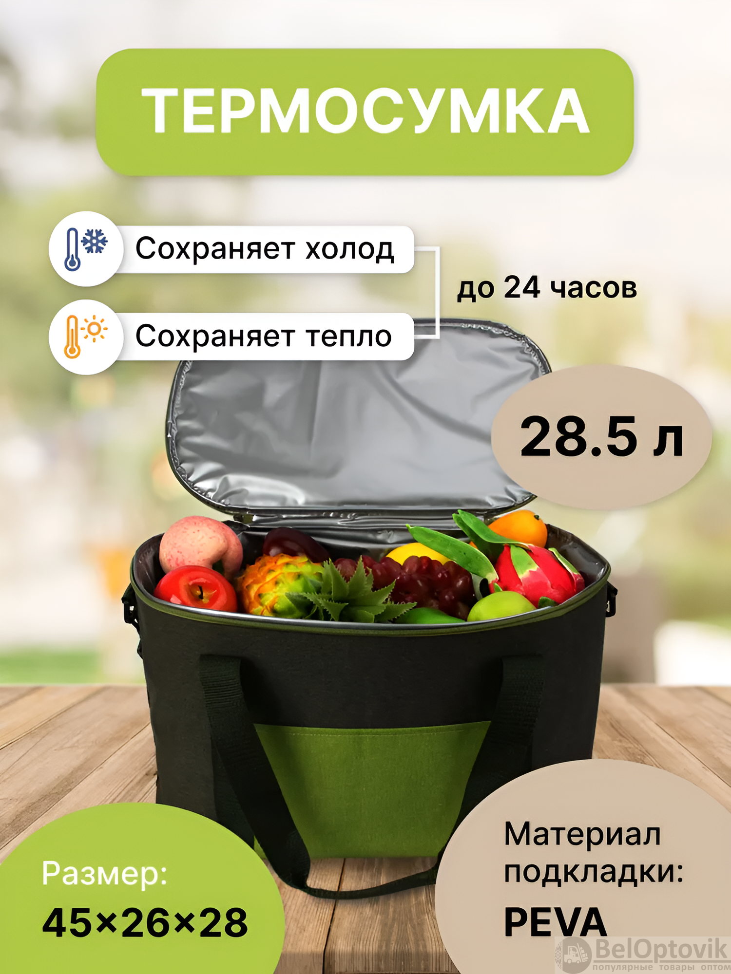 Эта термосумка – отличный выбор для тех, кто ищет надежное и удобное решение для транспортировки продуктов и напитков. Ее объем составляет 28,5 литра, что позволяет сохранять свежесть и температуру продуктов продолжительное время, делая её идеальной для пикников, поездок на природу и других мероприятий.