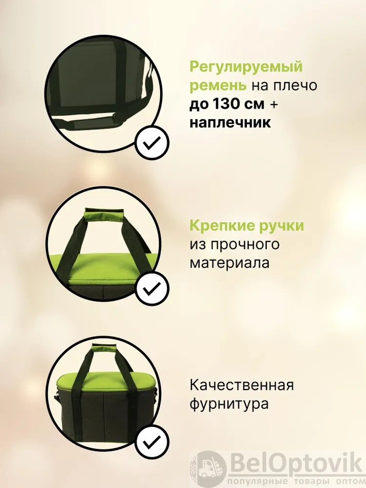 Материал внутренней отделки выполнен из полиэтиленвинилацетата (ПЭВА) и вспененного материала с антибактериальным покрытием, что обеспечивает высокую теплоизоляцию и предотвращает размножение бактерий. Внешнее покрытие изготовлено из прочного полиэстера, что делает сумку долговечной и устойчивой к внешним воздействиям. Сумка оснащена боковыми ручками и регулируемым по длине наплечным ремнем для удобной транспортировки, а также внешним карманом для хранения мелочей.