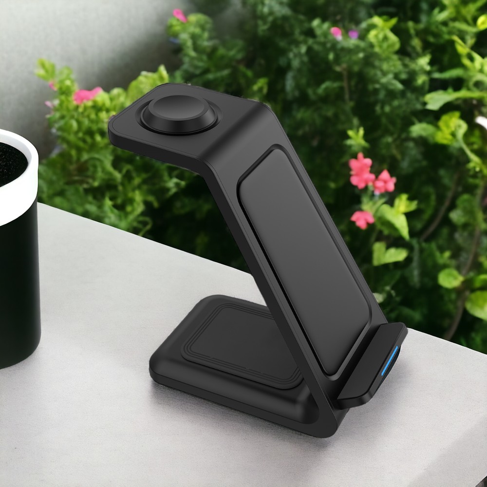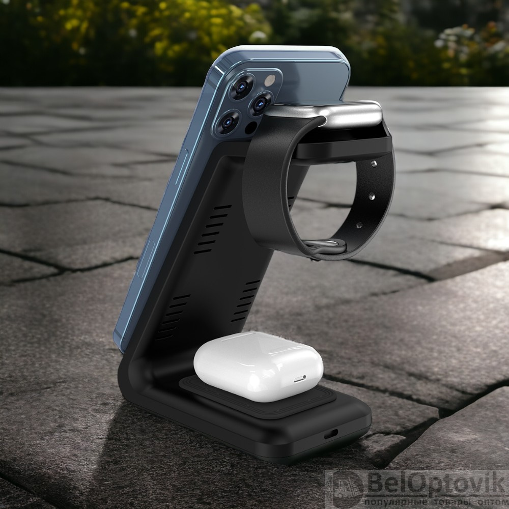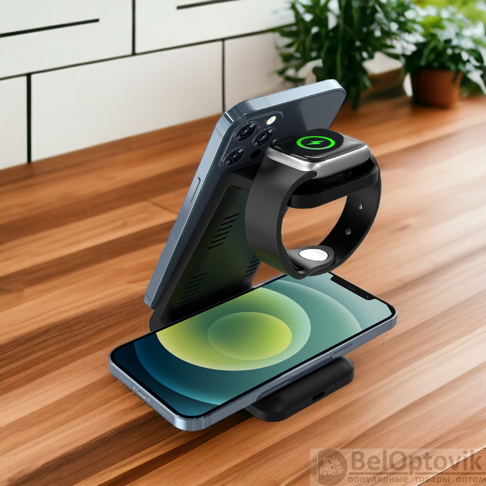 Особенности: беспроводная зарядка 15W, разъемы USB Type-C, три области для зарядки телефона, часов и наушников, световая индикация, подставка под телефон