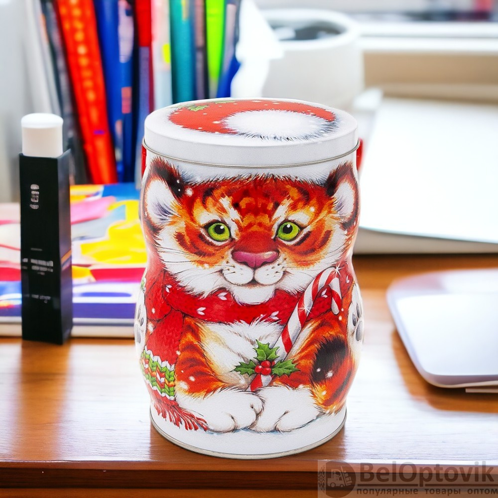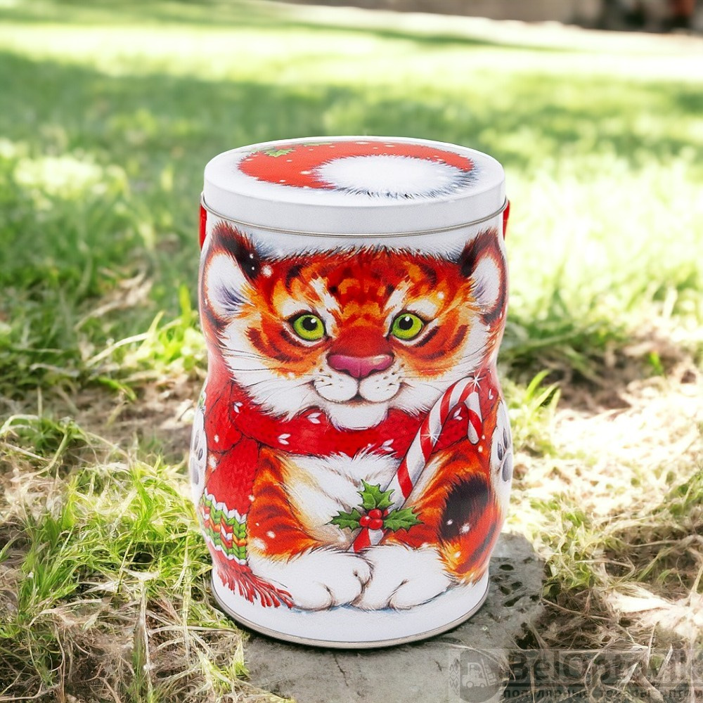 Особенности: украшен изображением тигренка с его характерными полосками и выразительными чертами, идеально подходит для хранения сладостей, мелких предметов или как декоративный элемент