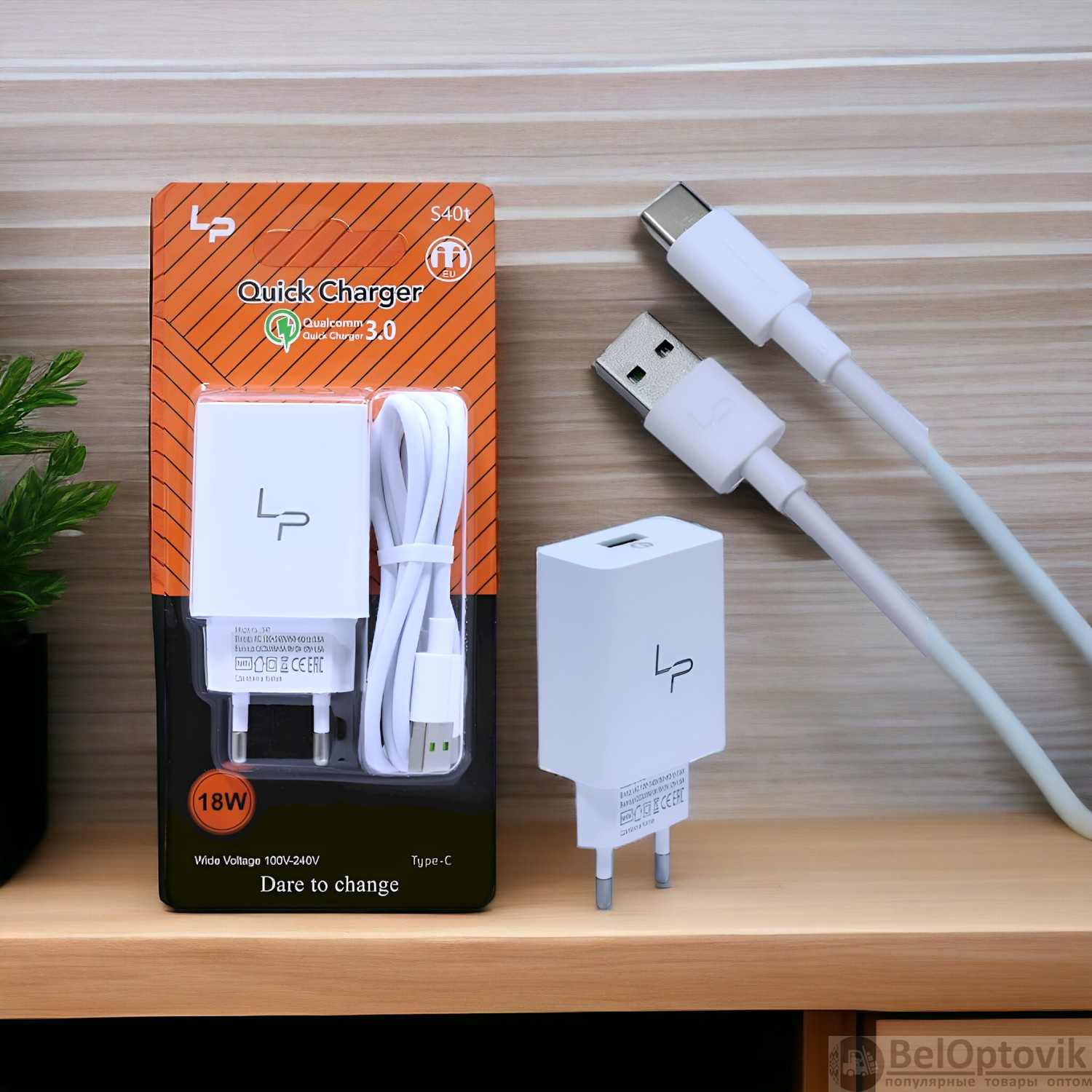 Купить Сетевое зарядное устройство LP S40t QC3.0 5V/3.1A, 1USB, с кабелем Type-C 1м, белый на нашем сайте можно ОПТОМ от 20 шт. или меньше, если Вы покупаете у нас и другие товары (сборный заказ)