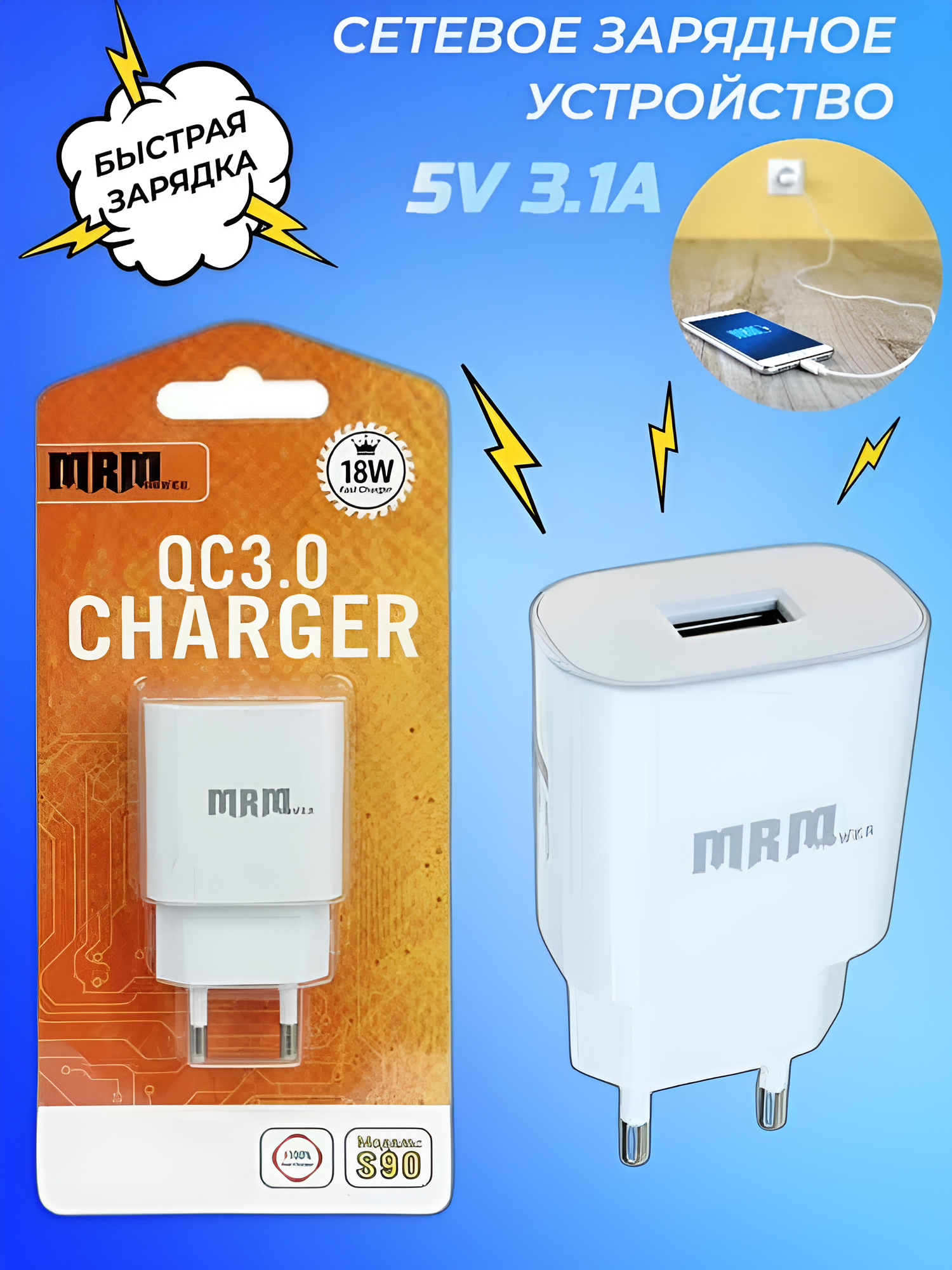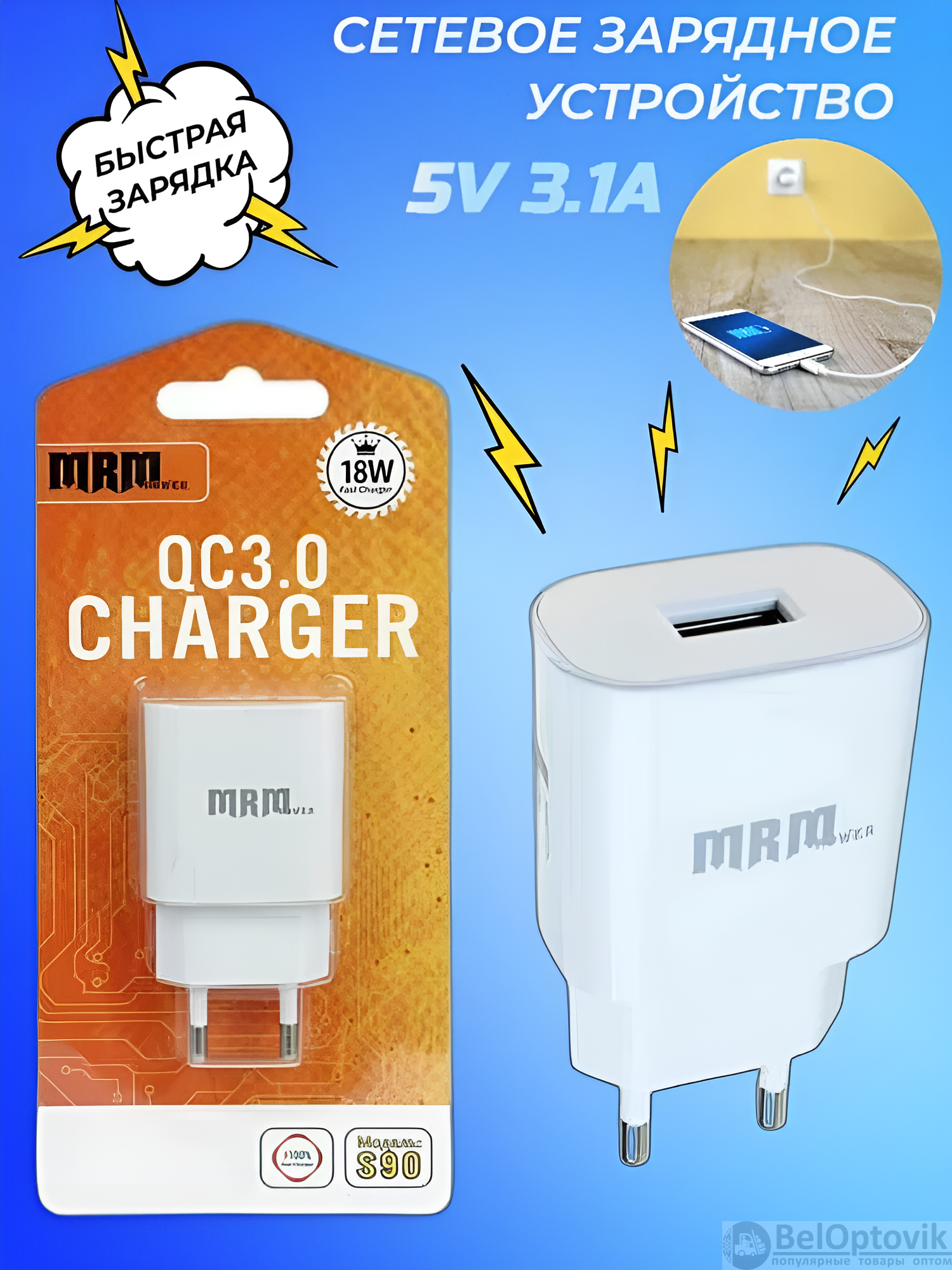 Купить Сетевое зарядное устройство MRM S90 5V/3.1A, 1USB QC3.0, с кабелем Lightning 1м, белый на нашем сайте можно ОПТОМ от 20 шт. или меньше, если Вы покупаете у нас и другие товары (сборный заказ)