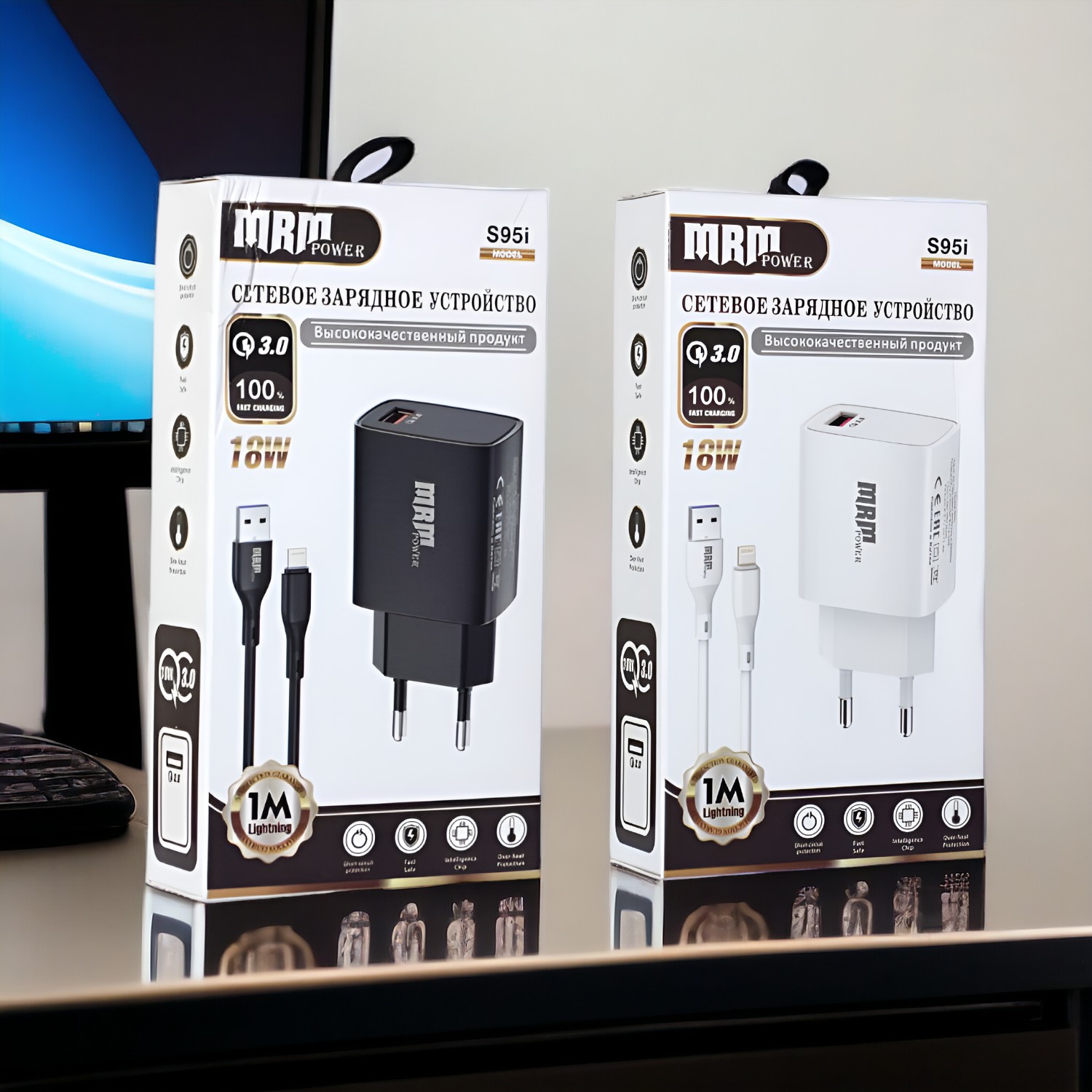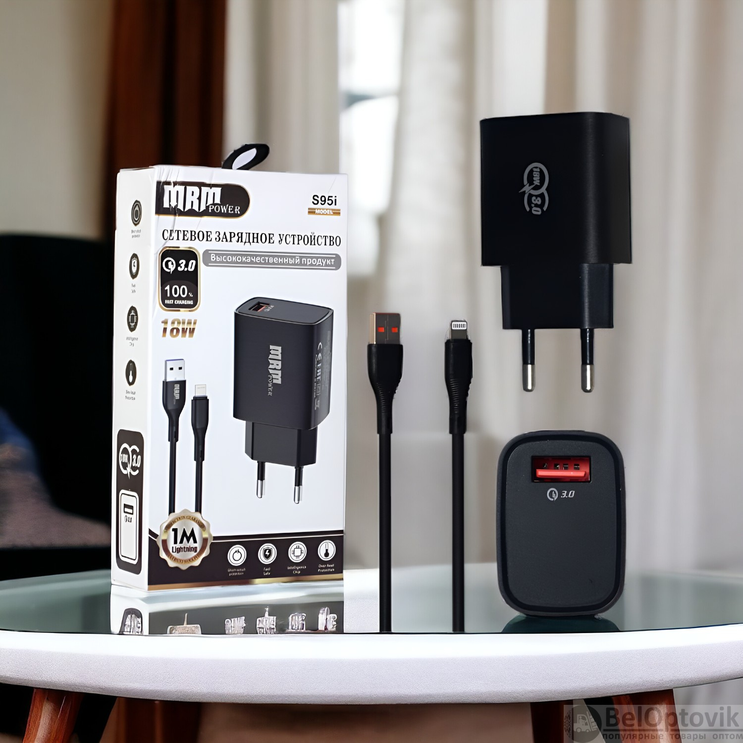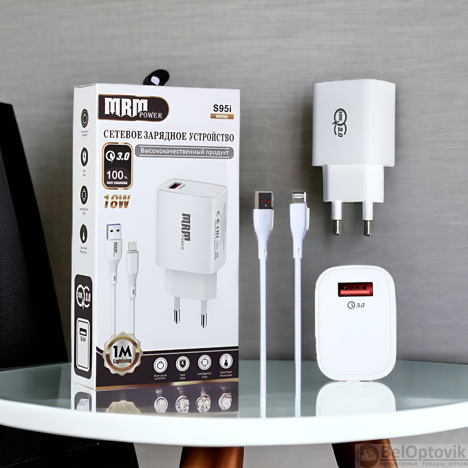 Купить Сетевое зарядное устройство MRM S95 5V/3.1A, 1USB QC3.0, с кабелем Lightning 1м, черный и белый цвет на нашем сайте можно ОПТОМ от 20 шт. или меньше, если Вы покупаете у нас и другие товары (сборный заказ)