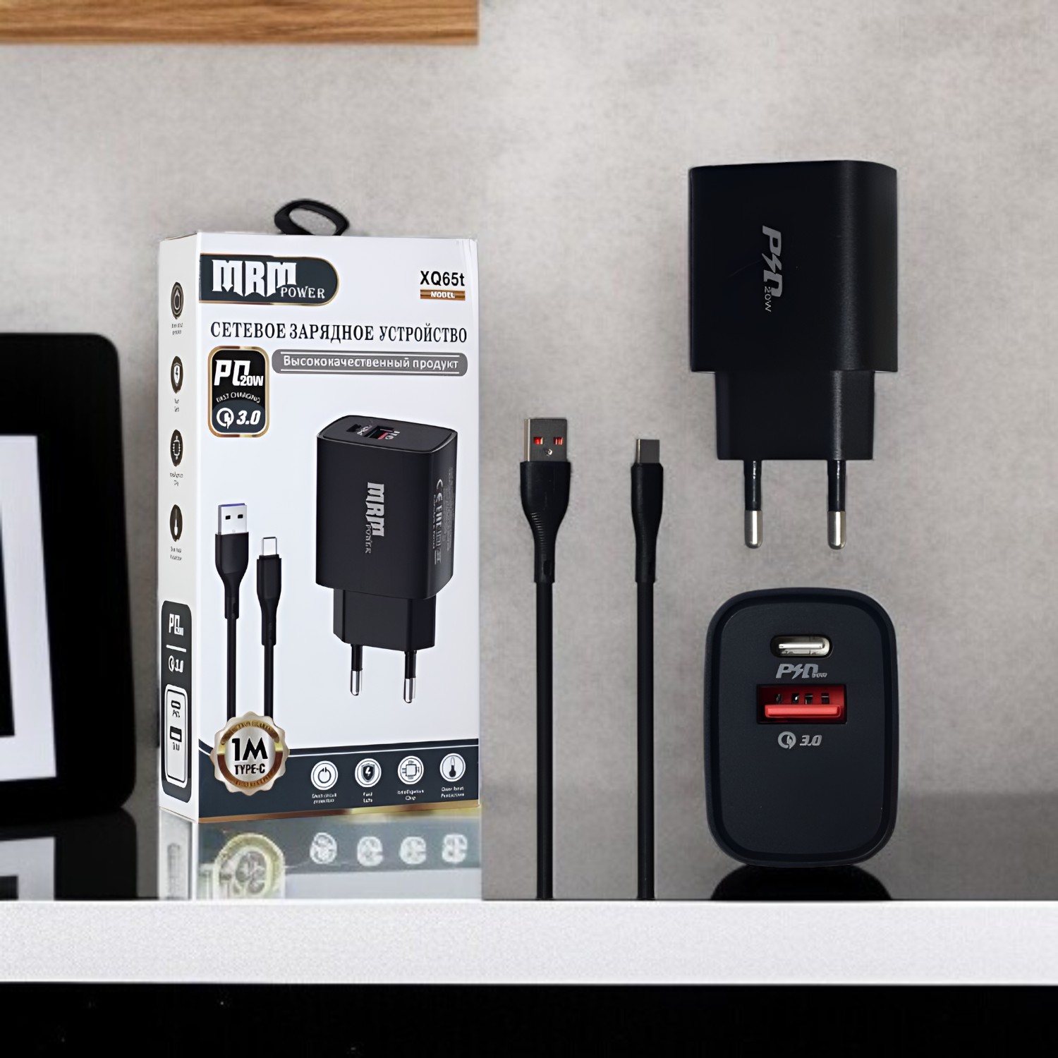 Купить Сетевое зарядное устройство MRM XQ65 PD20W + QC3.0 5V/3.1A, 1USB, с кабелем Type-C 1м, черный и белый цвет на нашем сайте можно ОПТОМ от 20 шт. или меньше, если Вы покупаете у нас и другие товары (сборный заказ)