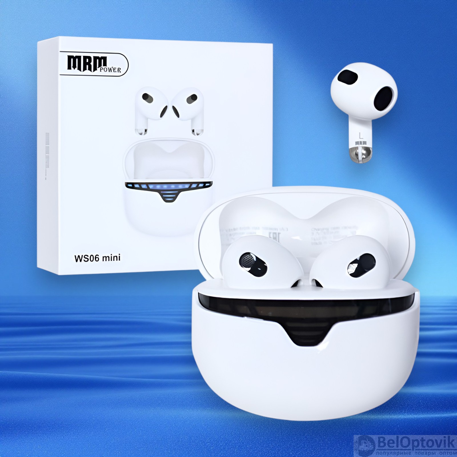 Купить Наушники беспроводные MRM Power WS06 (mini), внутриканальные, белые / Качество звука с стильной подсветкой на нашем сайте можно ОПТОМ от 20 шт. или меньше, если Вы покупаете у нас и другие товары (сборный заказ)