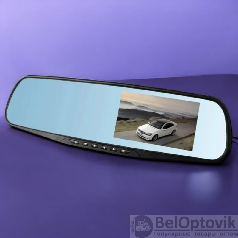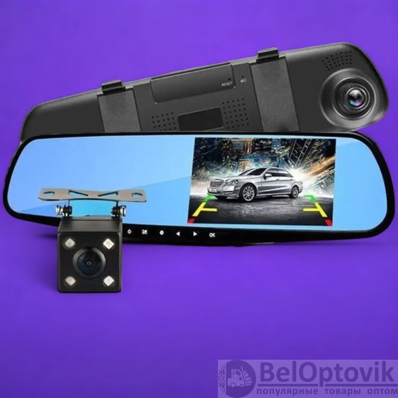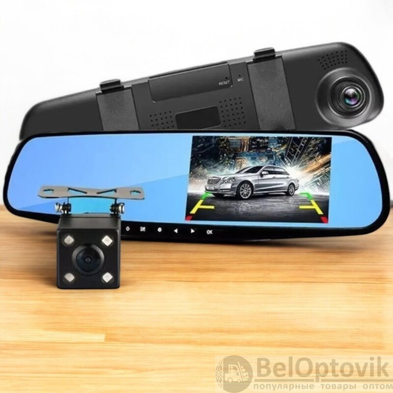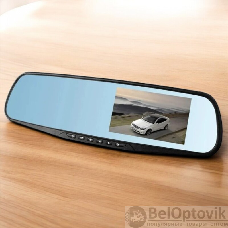 Запись с обеих камер: Изображение выводится на 4.3-дюймовый ЖК-дисплей, встроенный в зеркало, с разрешением 960x480 пикселей.
