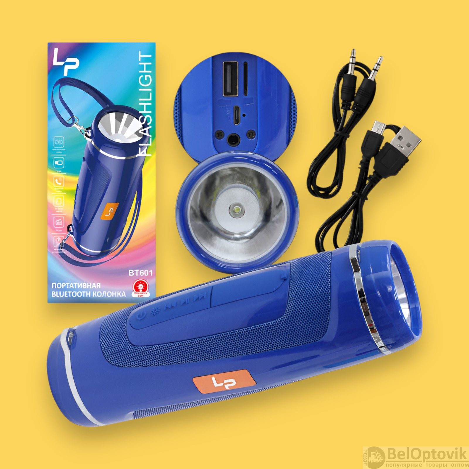 Почему купить Портативная колонка LP BT601, Bluetooth, TF/USB/3,5 мм jack, встроенный фонарик, ремешок, голубой / Музыка и свет в одном устройстве оптом выгодно у нас:
