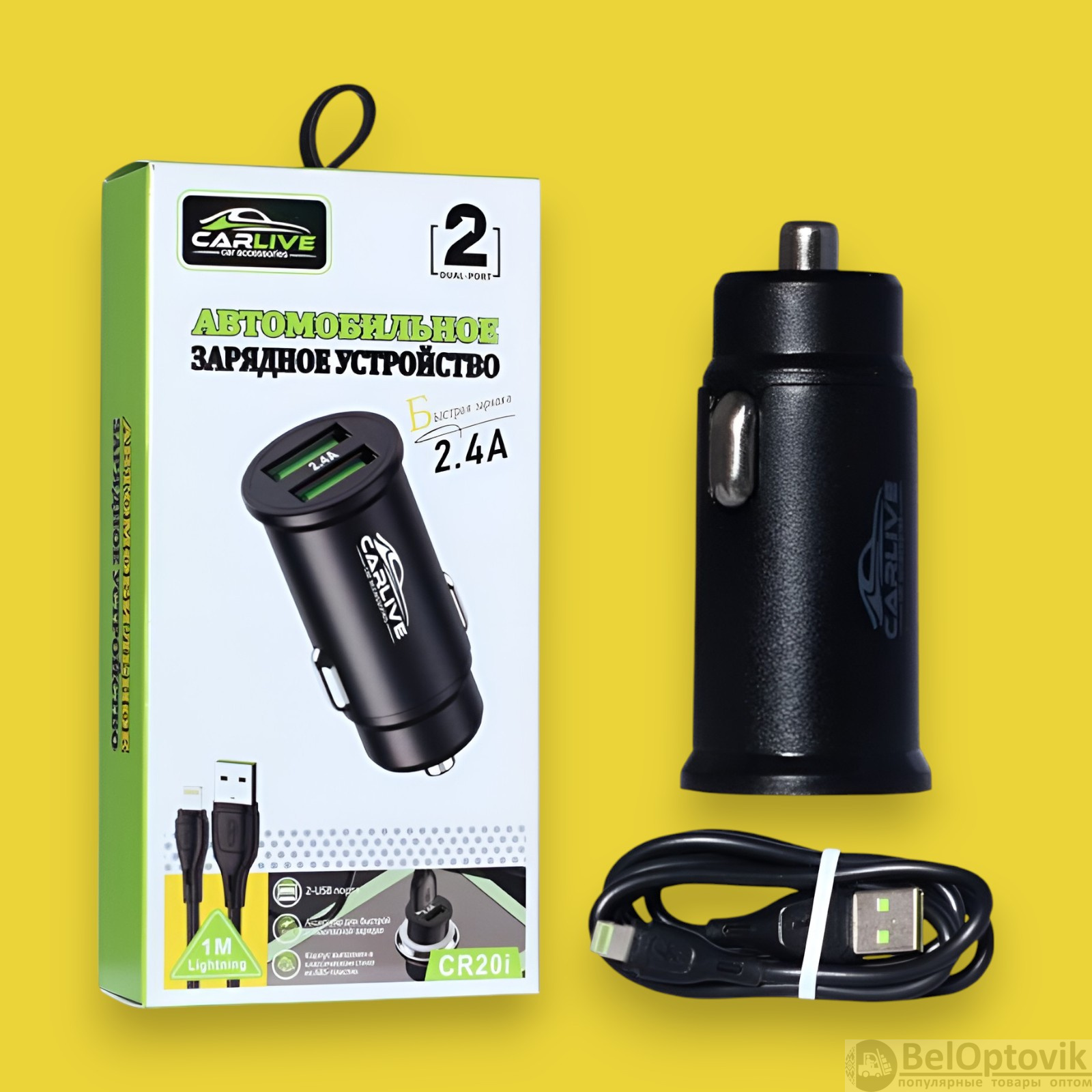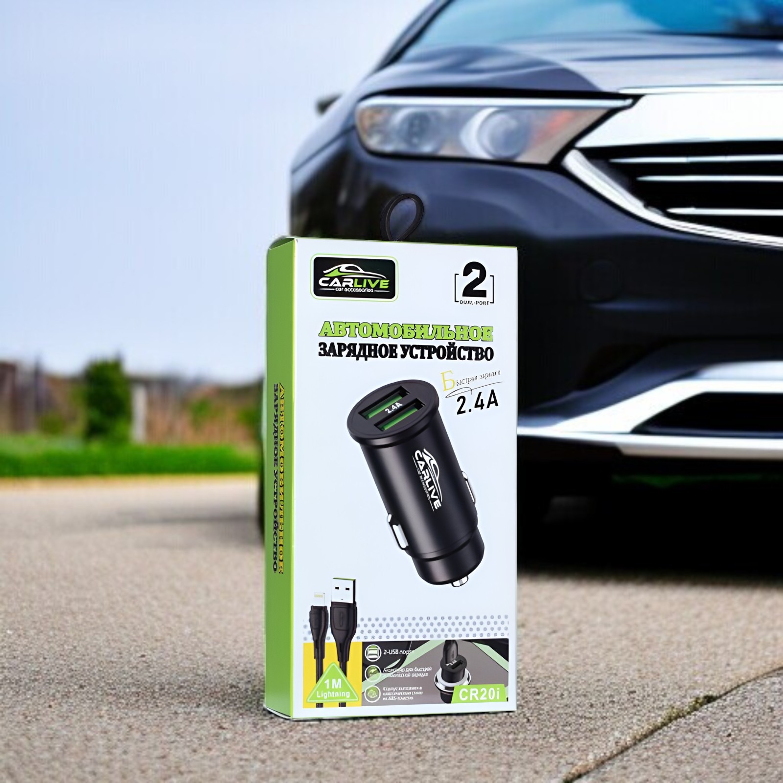 Купить Автомобильное зарядное устройство, выходной ток 5V/2.4A, 2 USB-порта, мощность 24 Вт, кабель Lightning 1 м, черный / Двойная зарядка с удобным кабелем в комплекте на нашем сайте можно ОПТОМ от 20 шт. или меньше, если Вы покупаете у нас и другие товары (сборный заказ)