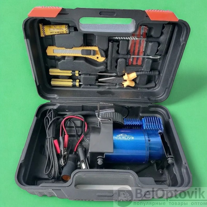 Купить Компрессор с ремнабором для бескамерных шин CARLIVE CL111 / Удобство и надёжность на нашем сайте можно ОПТОМ от 20 шт. или не менее 5, если Вы покупаете у нас и другие товары (сборный заказ).