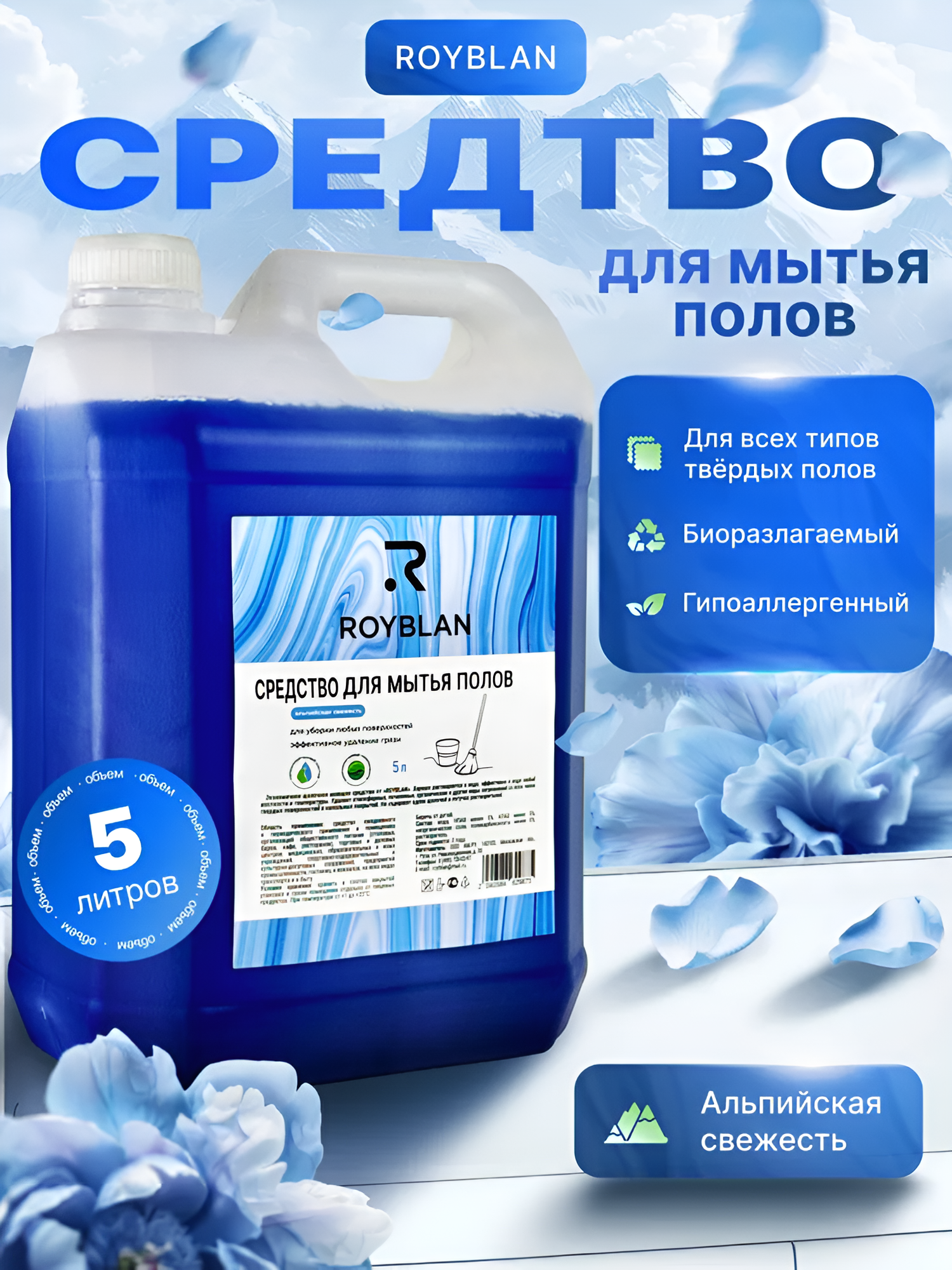 Купить Средство для мытья полов Royblan, 5 л, ароматы лаванды и альпийской свежести, ПНД / Свежая чистота для вашего дома на нашем сайте можно ОПТОМ от 20 шт. или меньше, если Вы покупаете у нас и другие товары (сборный заказ)
