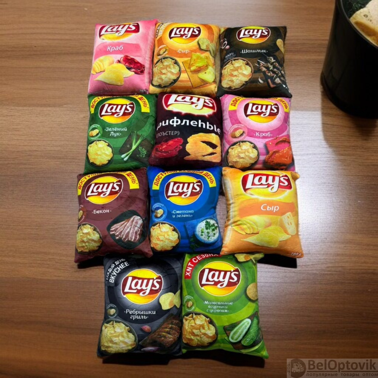 Дизайн: в форме упаковки чипсов Lay’s (разные вкусы: краб, сыр, бекон, зелёный лук, сметана и зелень, шашлык, грибы со сметаной, рёбрышки)