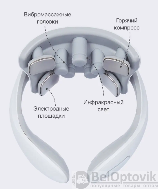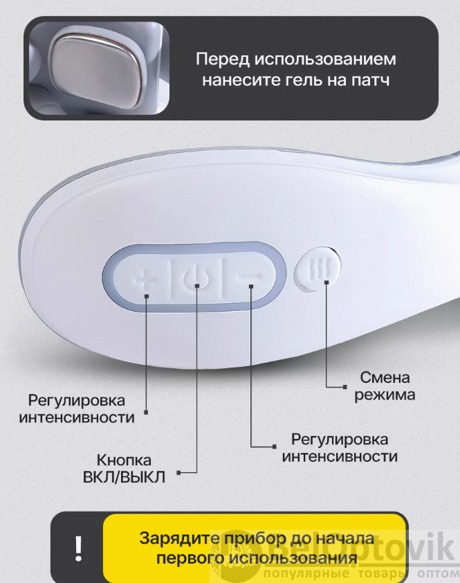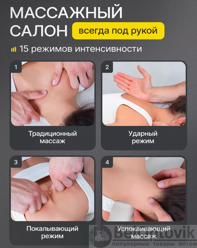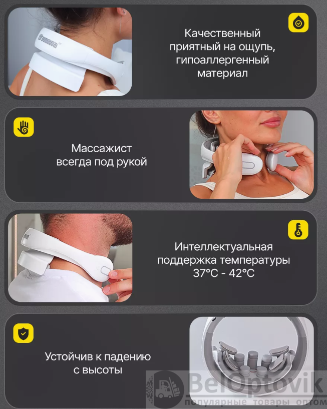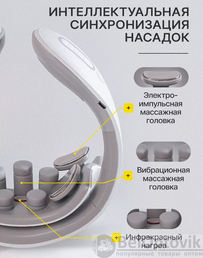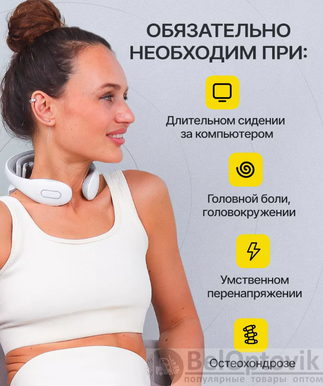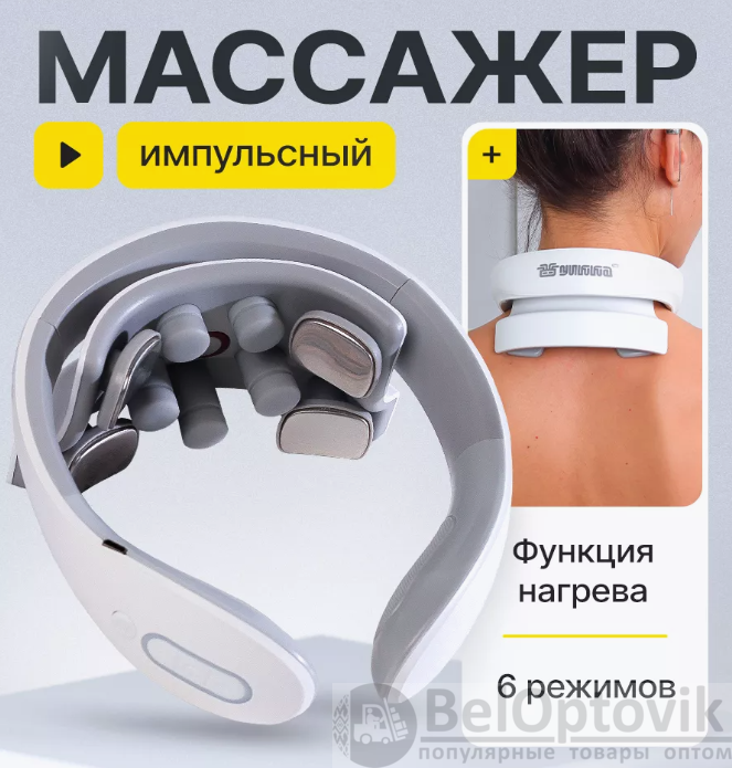 Купить Массажер для шеи электрический импульсный / EMS вибромассажер на нашем сайте можно ОПТОМ от 20 ед. или не менее 5 ед. при формировании сборного заказа. Это многофункциональный и современный массажер для шеи и плеч. Благодаря компактному размеру, вы можете пользоваться им не только дома, но и брать с собой в поездки и путешествия, а так же использовать на работе. Главные особенности: Прибор имеет 6 режимов работы. 15 уровней интенсивности. Синхронный массаж в 9 зонах. Технология быстрого нагрева за 3 секунды. Интеллектуальная поддержка температуры 37C'-42C'. Массажер работает на основе технологии низкочастотного импульсного массажа TENS частотой воздействия менее 1000 Гц. Инструкция по использованию: перед первым использованием прибор необходимо зарядить! Мощность воздействия регулируется кнопками плюс(+) и минус(-). Для выключения массажера удерживайте кнопку выключения до погашения индикаторов. Массажер работает от встроенного аккумулятора, в комплекте идет зарядка USB. Перед использованием увлажните массажируемую область гелем для лучшего эффекта, гель идет в комплекте с массажером. Рекомендуемое время массажа 15 минут в день .