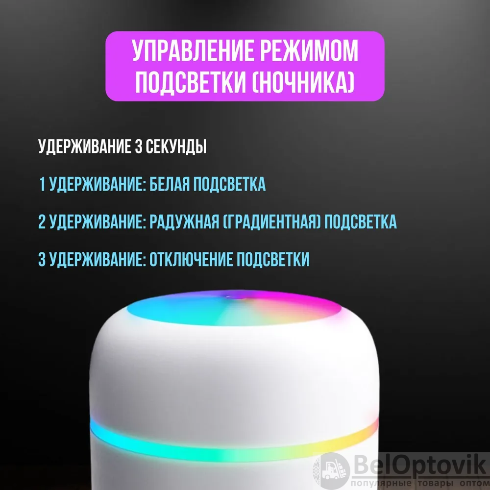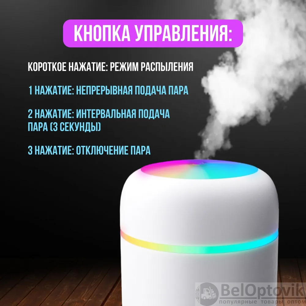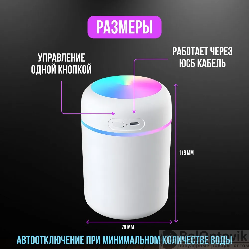 Компактный белый корпус из прочного пластика гармонично впишется в любой интерьер. Мощность устройства всего 2 Вт, что делает его энергоэффективным. Увлажнитель подходит для установки на столе, полу или в автомобиле, обеспечивая универсальность использования.
