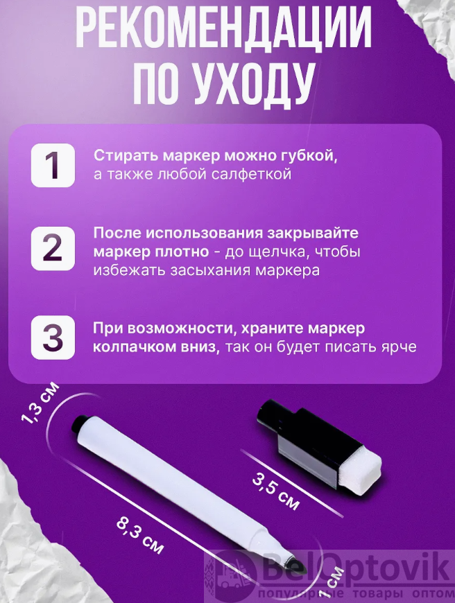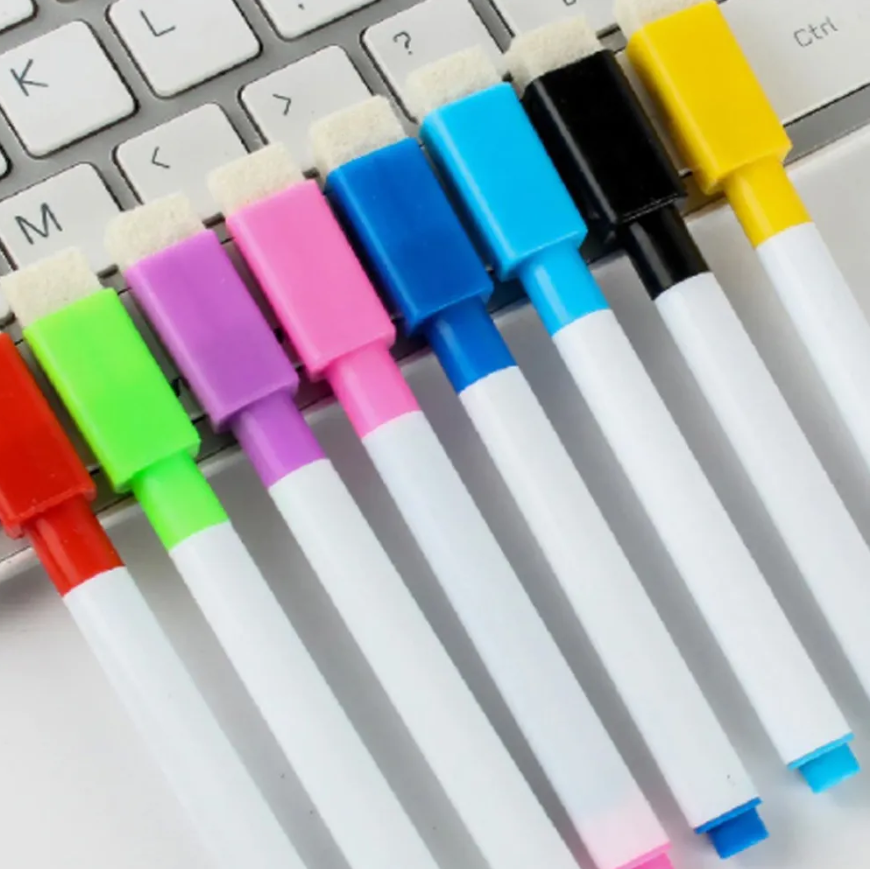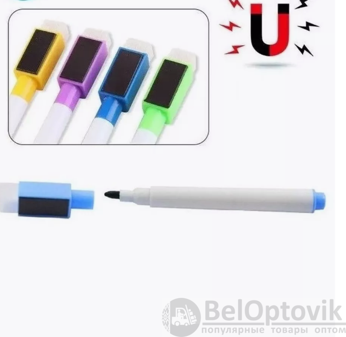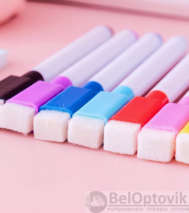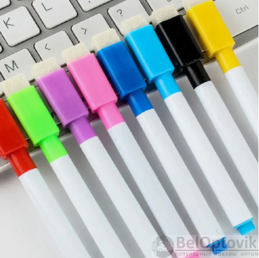 Маркер оснащен губкой (специальный стиратель ластик) на колпачке, что позволяет стирать без разводов и не имеет магнита. Подойдут для магнитномаркерной доски. Хранить маркеры нужно вниз колпачком в канцелярской подставке или в органайзере. Маркеры надежно держатся на металлических поверхностях. В упаковке 8 штуки разноцветных фломастера. Подойдут для белой магнитной доски или планера. Пригодятся в офисных, школьных и в других учебных заведениях. Не стоит писать фломастером на меловой доске. Они легко стираются обычной сухой (сухостираемой) тряпкой, салфеткой или губкой. Канцтовары имеют не толстую ширину маркерной линии письма 1 мм, ими удобно рисовать нейрографикуа. Маленький художник может разукрашивать ими раскраску и карточки, рисовать на листе бумаге в альбоме, в скетчбук, холст, граффити или даже вести записи или заметки в тетради или в блокноте. Развивающий комплект для ребенка имеет цветовое разнообразие. Комплектация: