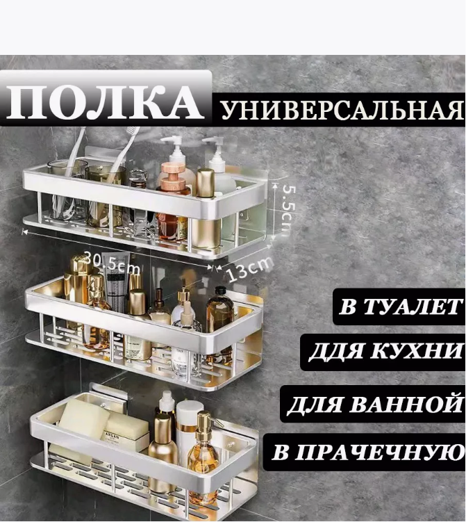 Настенные полки, незаменимая вещь для хранения и организации пространства а доме. Обладают большой функциональностью, используются для хранения любых предметов. Полки самоклеющиеся на кухне пригодятся для хранения, соусов, специй, губок и различных моющих средств. Настенные стелажи без сверления идеально впишутся в интерьер ванной, душевой и туалетной комнаты. А их стильные цвета идеально сочетаются с другими оттенками дизайна. Самоклеющаяся полка для ванны удобна для установки на нее средств гигиены, туалетной бумаги, поршков. Высокий бортик не позволяет предметам упасть, а перфорированное основание, не задерживает воду, тем самым предохраняя от плесени. Подвесные полки крепятся на специальные клейкие пластины, желательно не нагружать сразу же их. Дать несколько часов для их прочной фиксации. Не рекомендуется размещать на обоях, бетоне и штукатурке. Полки универсальные, без сверления хорошо закрепляются на гладких поверхностях- стекле, зеркале, плитке, мраморе и дереве. У нас представлены как обычные так и угловые настенные полки в двух цветах-черном и серебристом. Надеемся что вы останетесь довольны универсальными полками, ваш интерьер буде