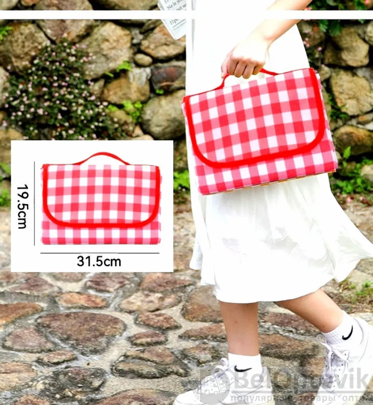 Размер подстилки для пикника в развернутом виде 200 х 200 см.. Коврик сделан в виде сумки, что удобно для хранения и транспортировки. Сам коврик складной, складывается в несколько раз и превращается в сумку размером 31.50 х 19.50 х 5.50 см. с удобной ручкой для переноски и верхом на застежке-липучке.