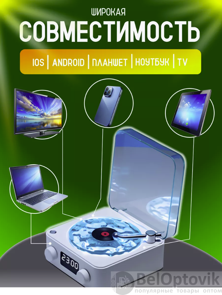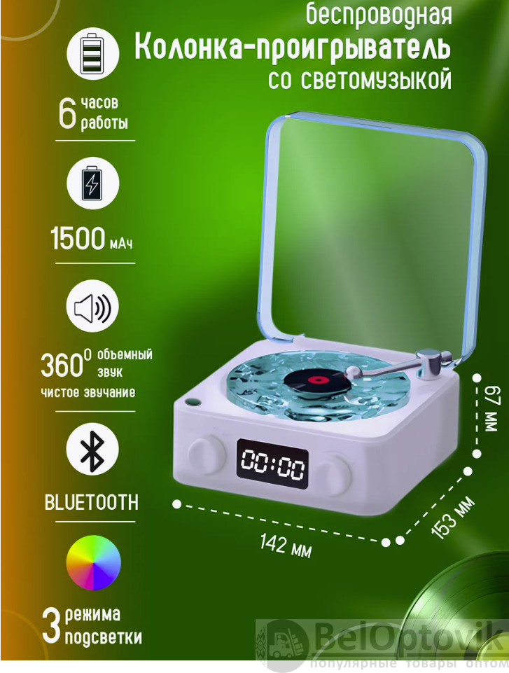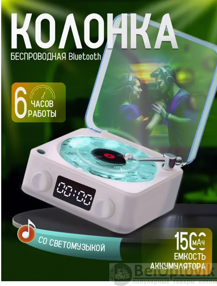 Обратите внимание Модель идет без будильника! Только часы. Беспроводная колонка в виде проигрывателя — идеальное сочетание ретро-стиля и современных технологий для любителей качественной музыки и эффектного дизайна. Эта Многофункциональная колонка с мощным музыкальным динамиком, Bluetooth и стильной подсветкой станет частью вашего праздника Дни Рождения, Новый год, Вечеринка. Подключение к телефону, ТV, ноутбуку или ПК осуществляется через Bluetooth или AUX. Компактный размер позволяет легко брать мини-колонку с собой, использовать ее дома, на природе, на кухне,в спальне в поездках, в путешествиях, в саду или во время занятий спортом. Благодаря качественному звуку, колонка наполняет пространство громким, качественным звуком. Мини-колонка станет другом для вашего ребенка. Используйте ее в качестве ночника, подключите телефон и воспроизводите сказки. Для взрослых Waves станет не только стильными настольными часами, но и прекрасным устройством для медитации и релаксации. Колонка может воспроизводить звуки природы, любимую музыку или белый шум, который часто используется для успокоения младенца. Мини колонка музыкальная Waves станет подарком как для детей, так и для взрослых.