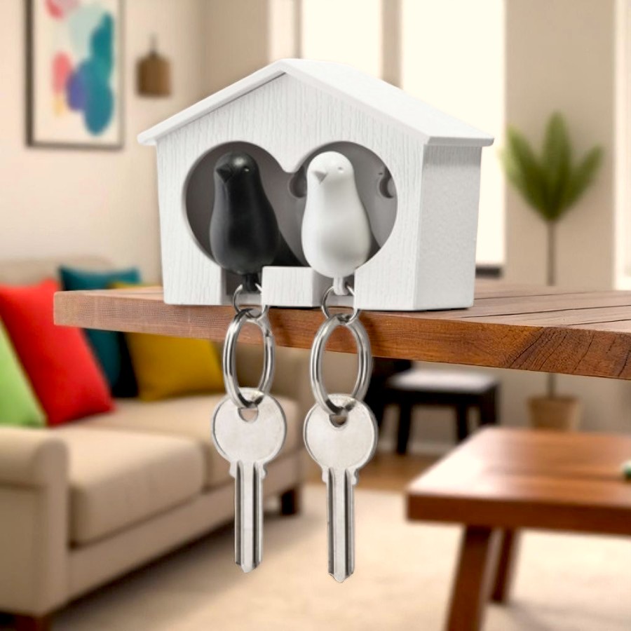 Замечательная идея от дизайнеров тайского бренда Qualy ― специальный домик для персональных хранителей ключей в виде птичек! Теперь Вы всегда будете знать, где ключи, а не искать их на полках перед выходом из дома. Держатель крепится к стене на специальный надежный скотч , либо вешается на два шурупа. Удобный брелок легко помещается внутрь домика, быстро находится в сумке или в кармане, а главное – он является еще и свистком! Так что можно оповестить домашних о своем приходе с работы:) В данном случае мы предлагаем Вам семейный вариант ― птичка для нее и для него. Сладкая парочка в домике будет обозначать, что семья в сборе! Основные характеристики: Оригинальные держатели для ключей ― отличное украшение любой прихожей.Фирменная подарочная упаковка от Qualy. Отличный подарок на новоселье. Размеры в упаковке, см 9,8 х 8 х 5,5 Страна производства - Таиланд.Страна бренда - Таиланд.