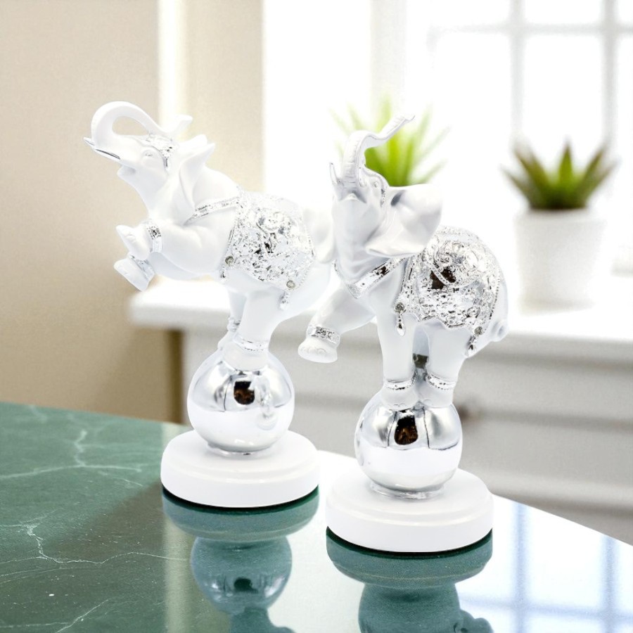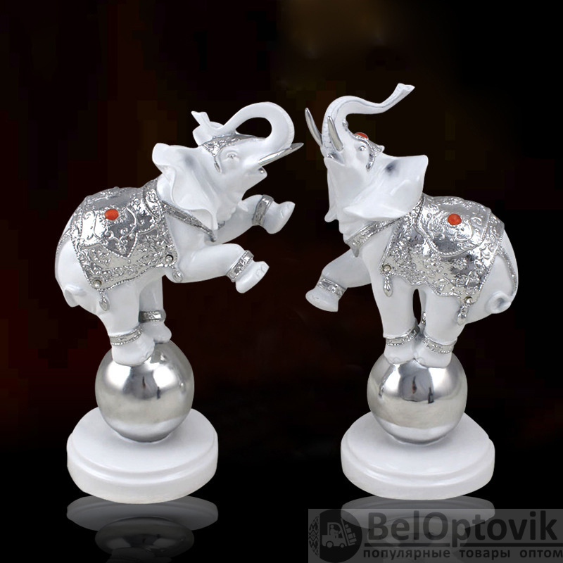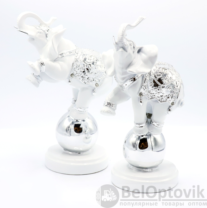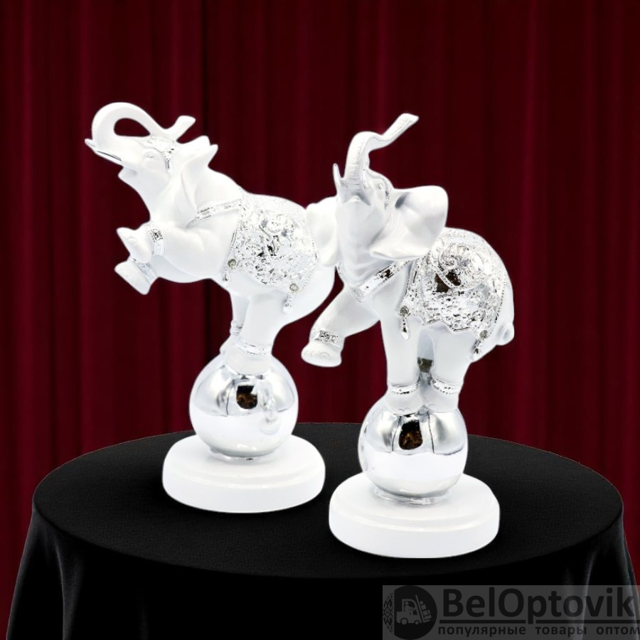 Набор статуэток "Слоны на шарах" станет оригинальным акцентом в вашем доме. Изготовлены из прочной и долговечной полирезины в элегантном сочетании белого и серого цветов. Размер каждой статуэтки 18× 13 ×34 см. Прекрасно подойдут для украшения гостиной, спальни или детской комнаты.